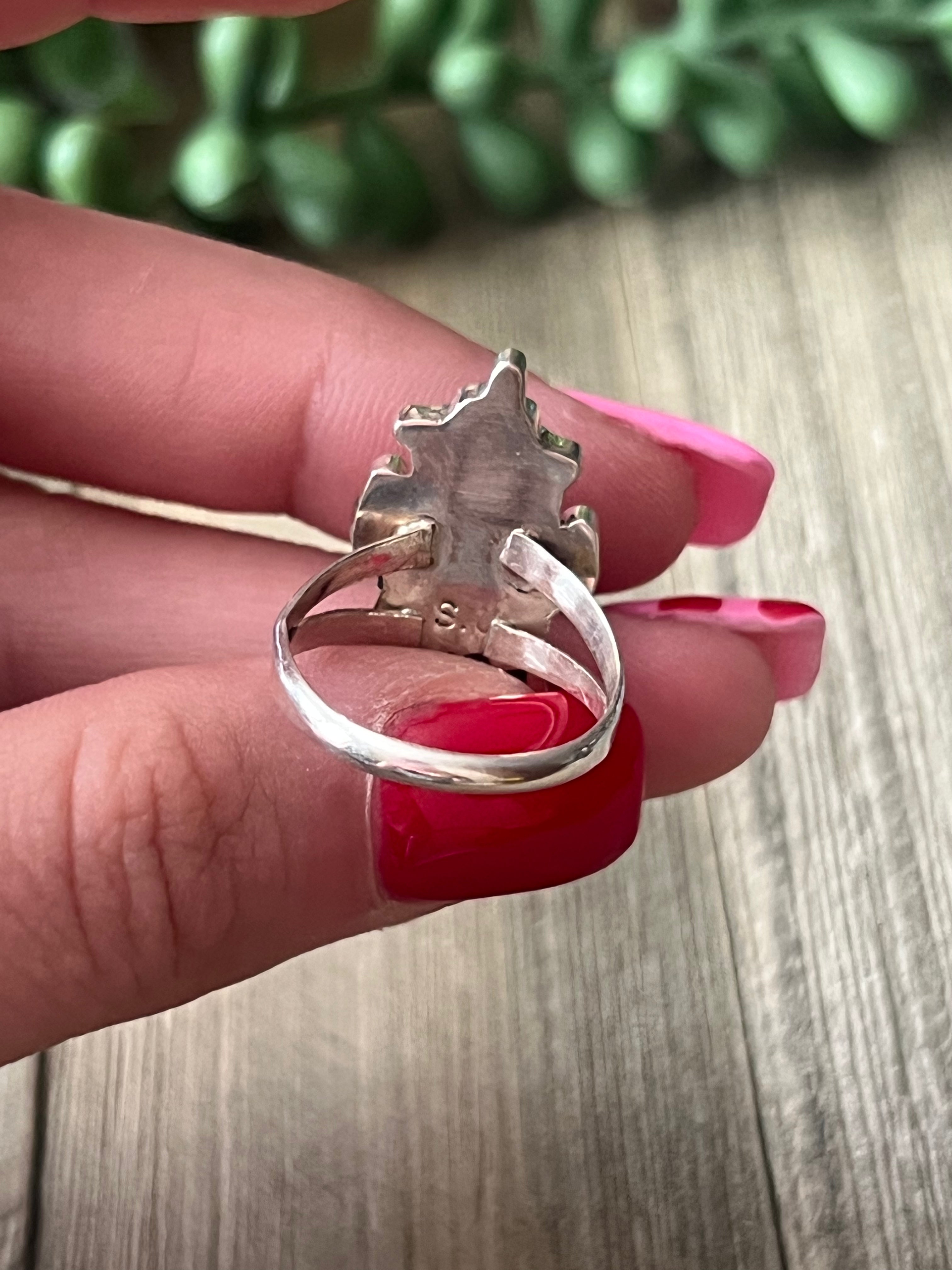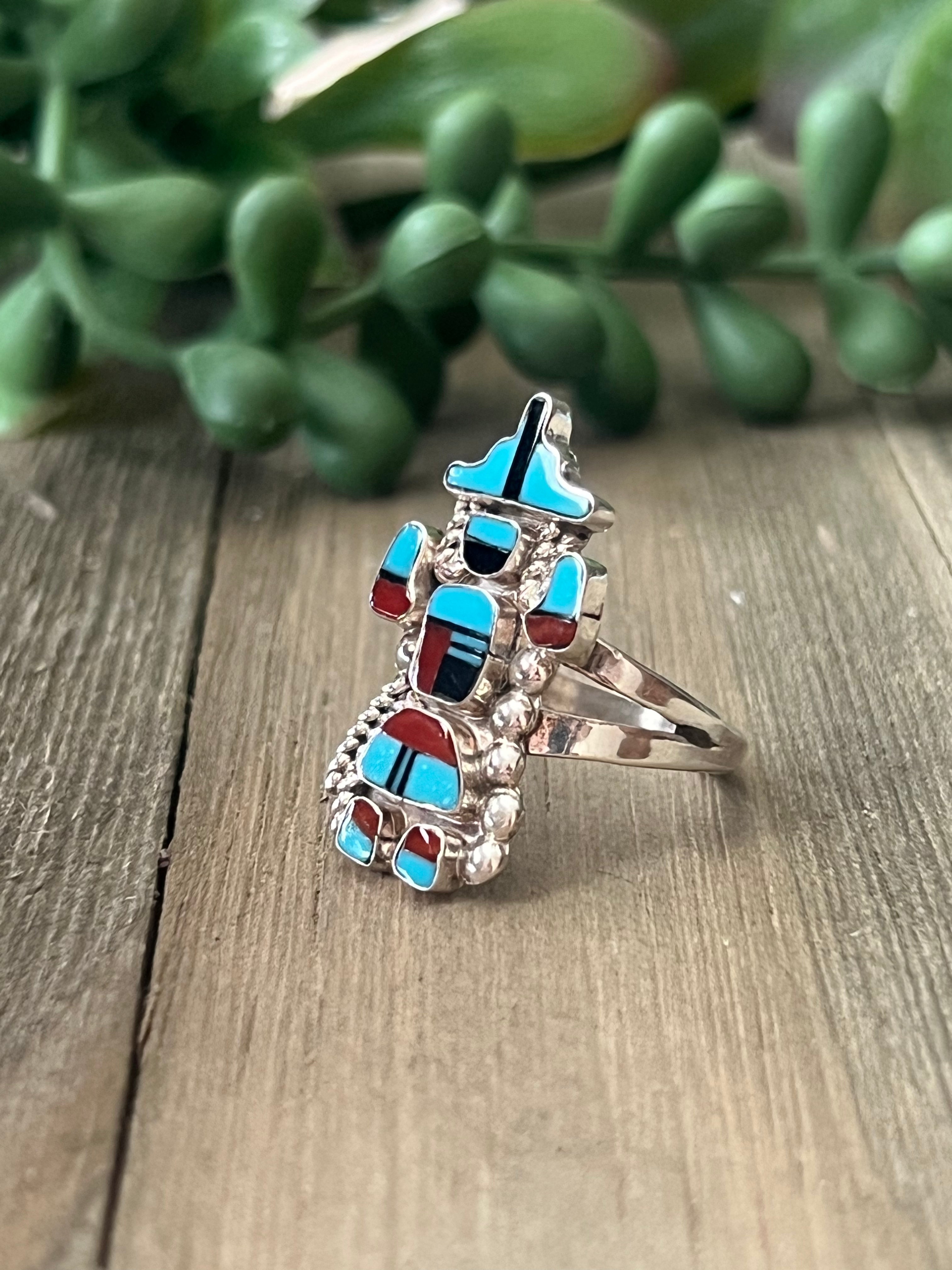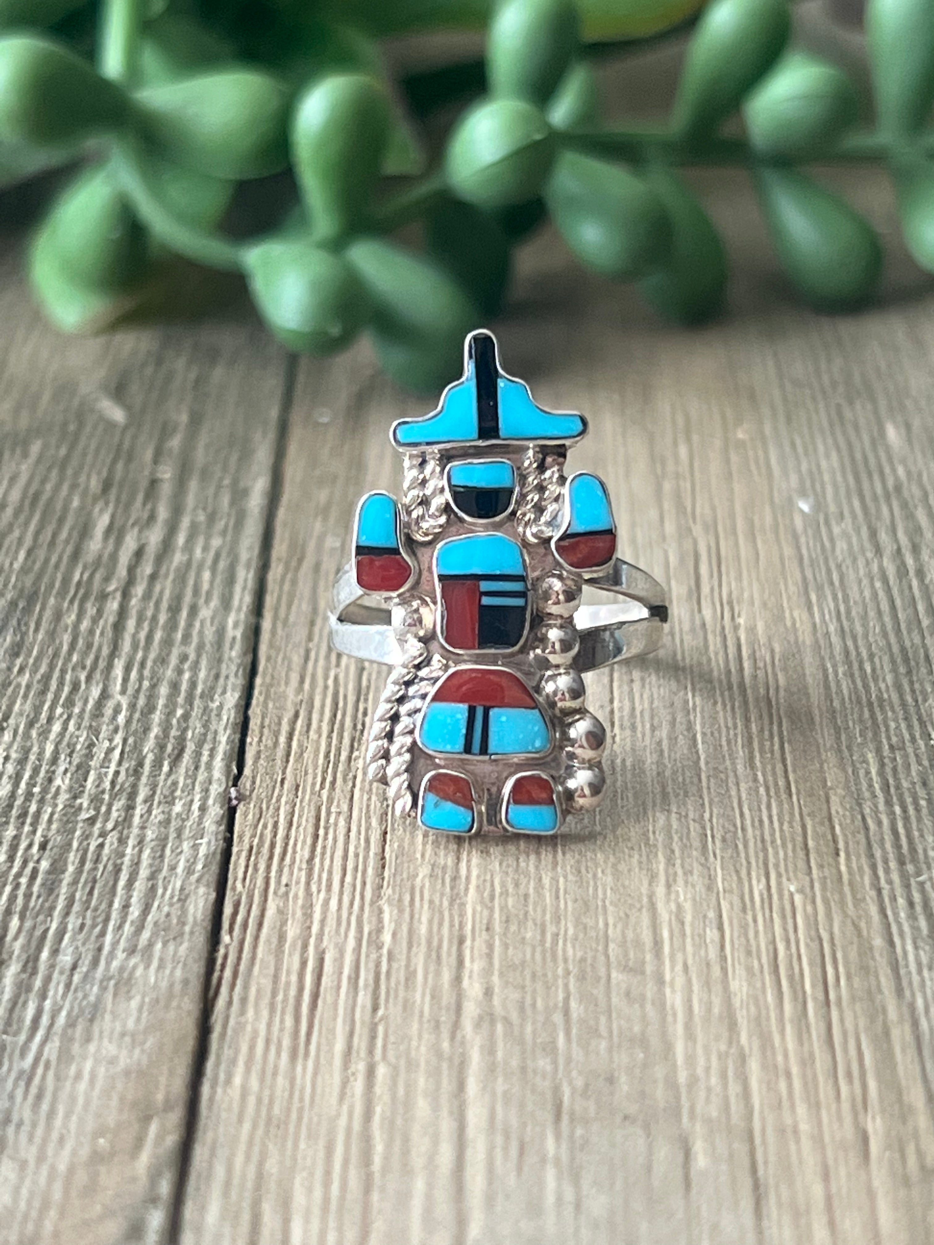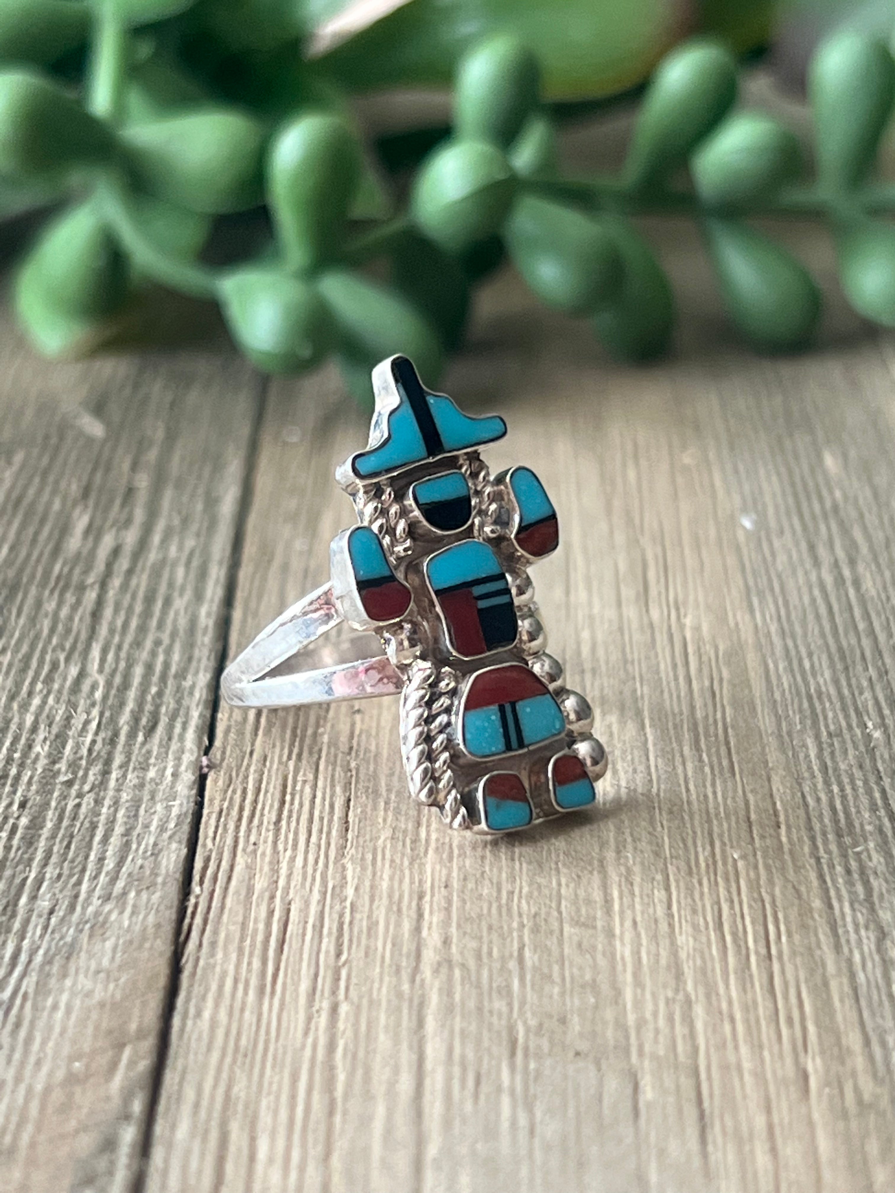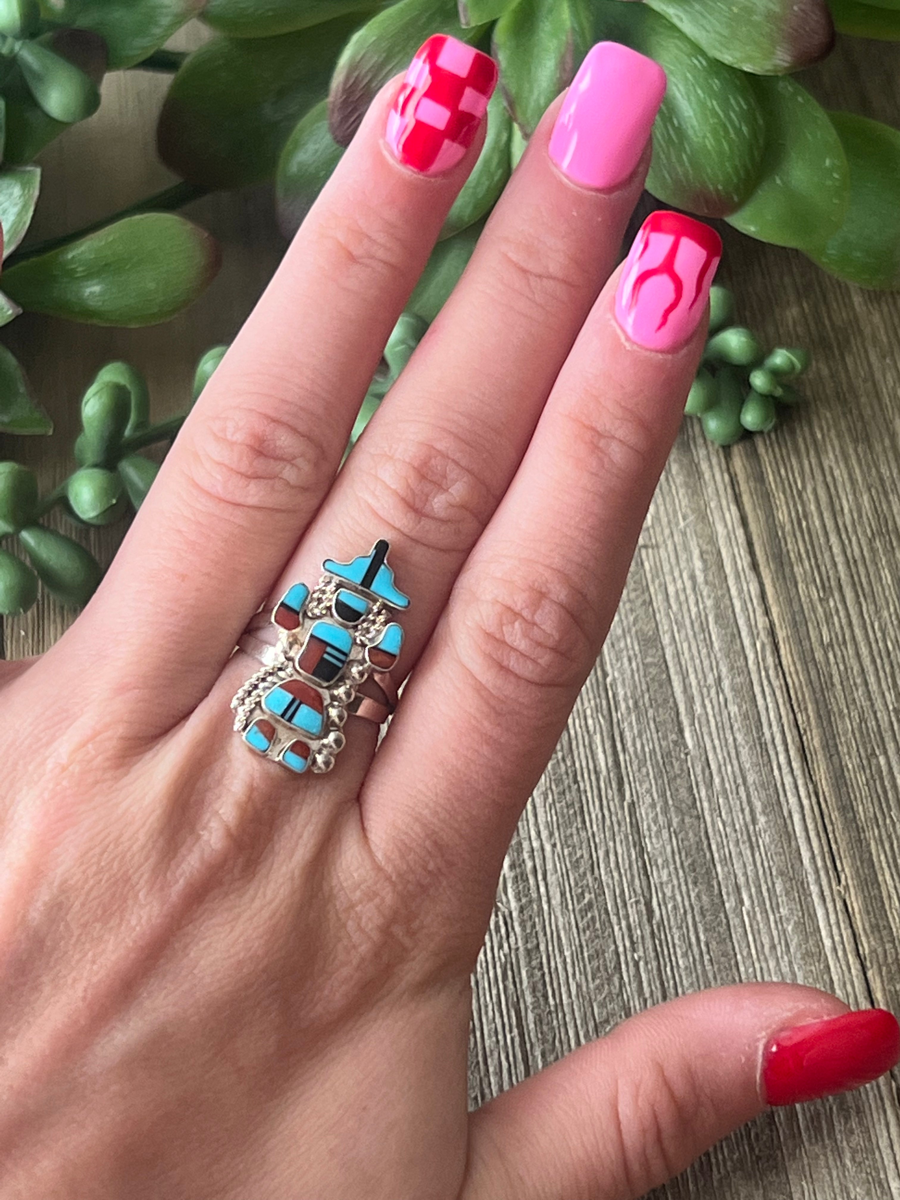 Zuni Made Multi Stone & Sterling Silver Inlay Ring. It measures 1 inch long and 1/2 of an inch wide. Stamped by the artist.