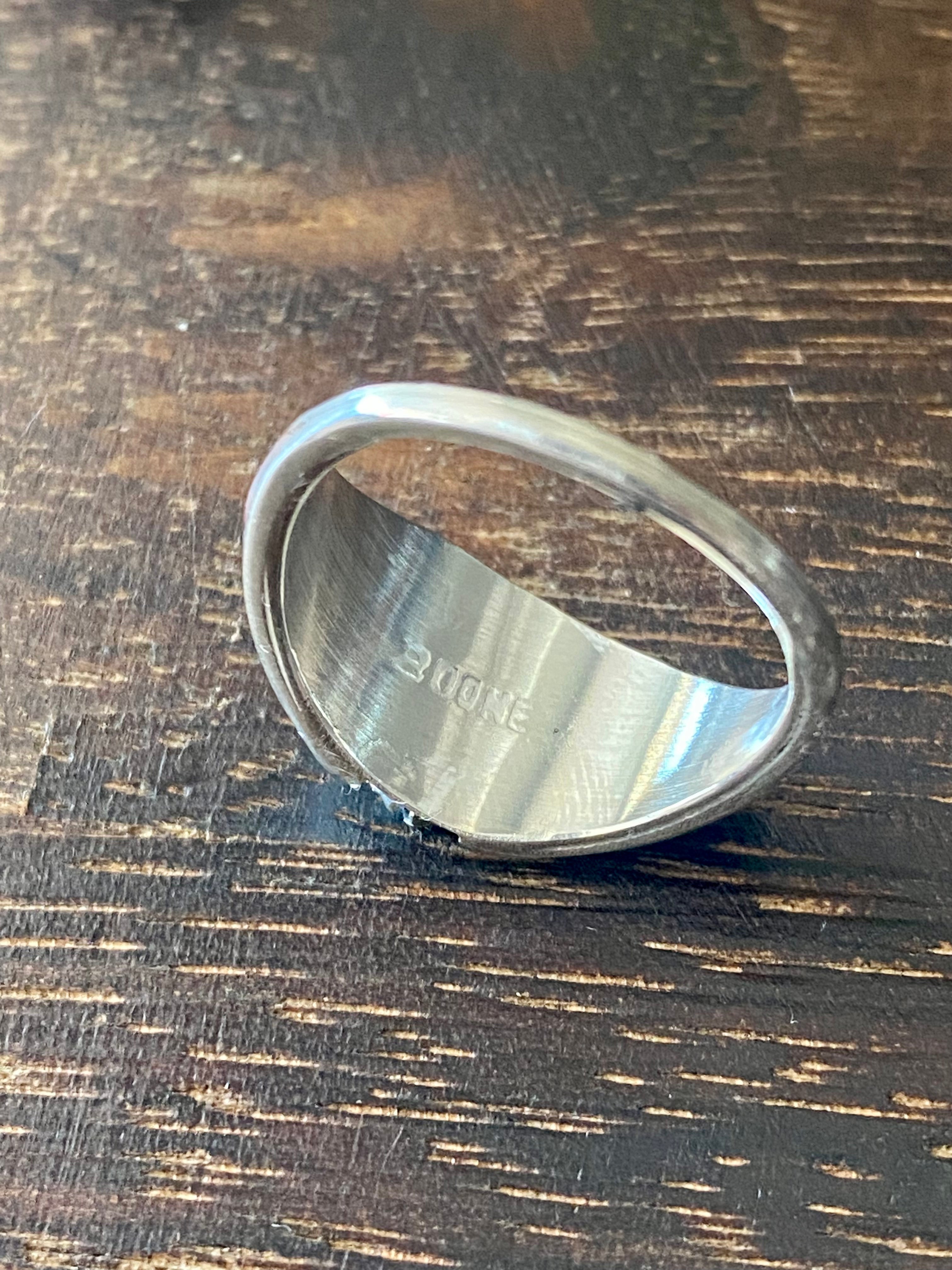Zuni Made Multi Stone & Sterling Silver Inlay Ring Size 7.5. It measures just under 1/2 of an inch long and 3/4 of an inch wide. Signed by the artist.