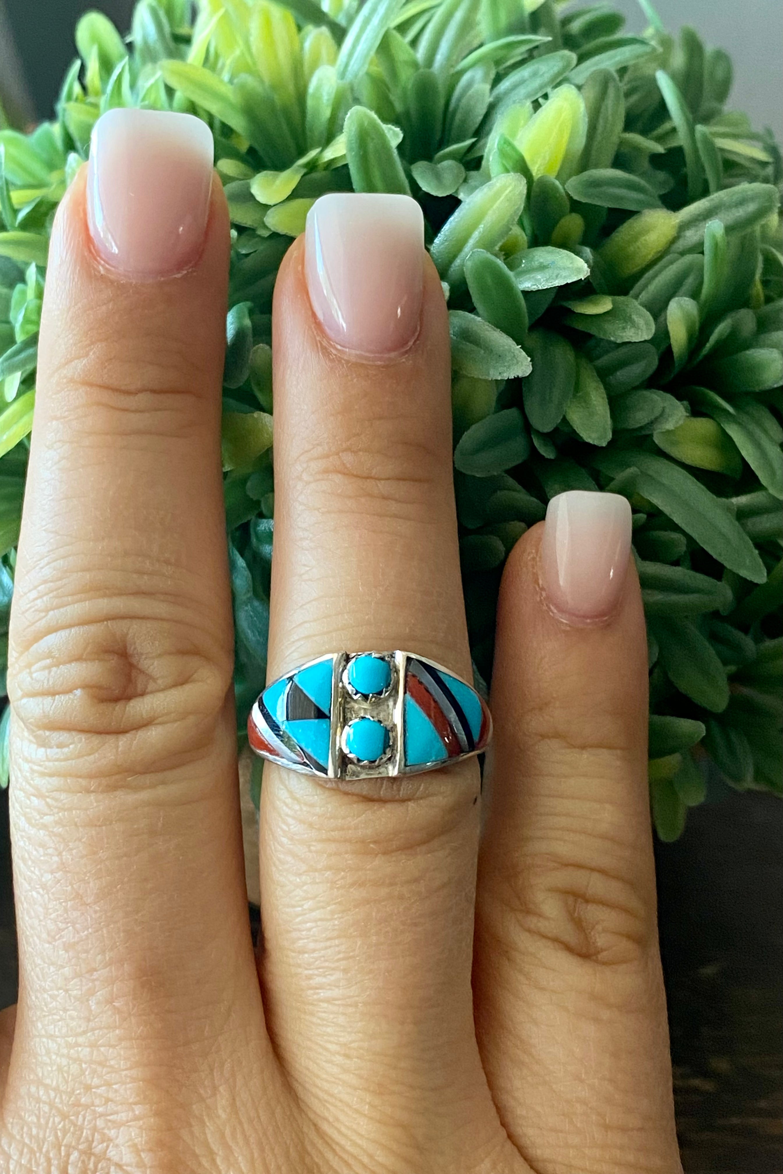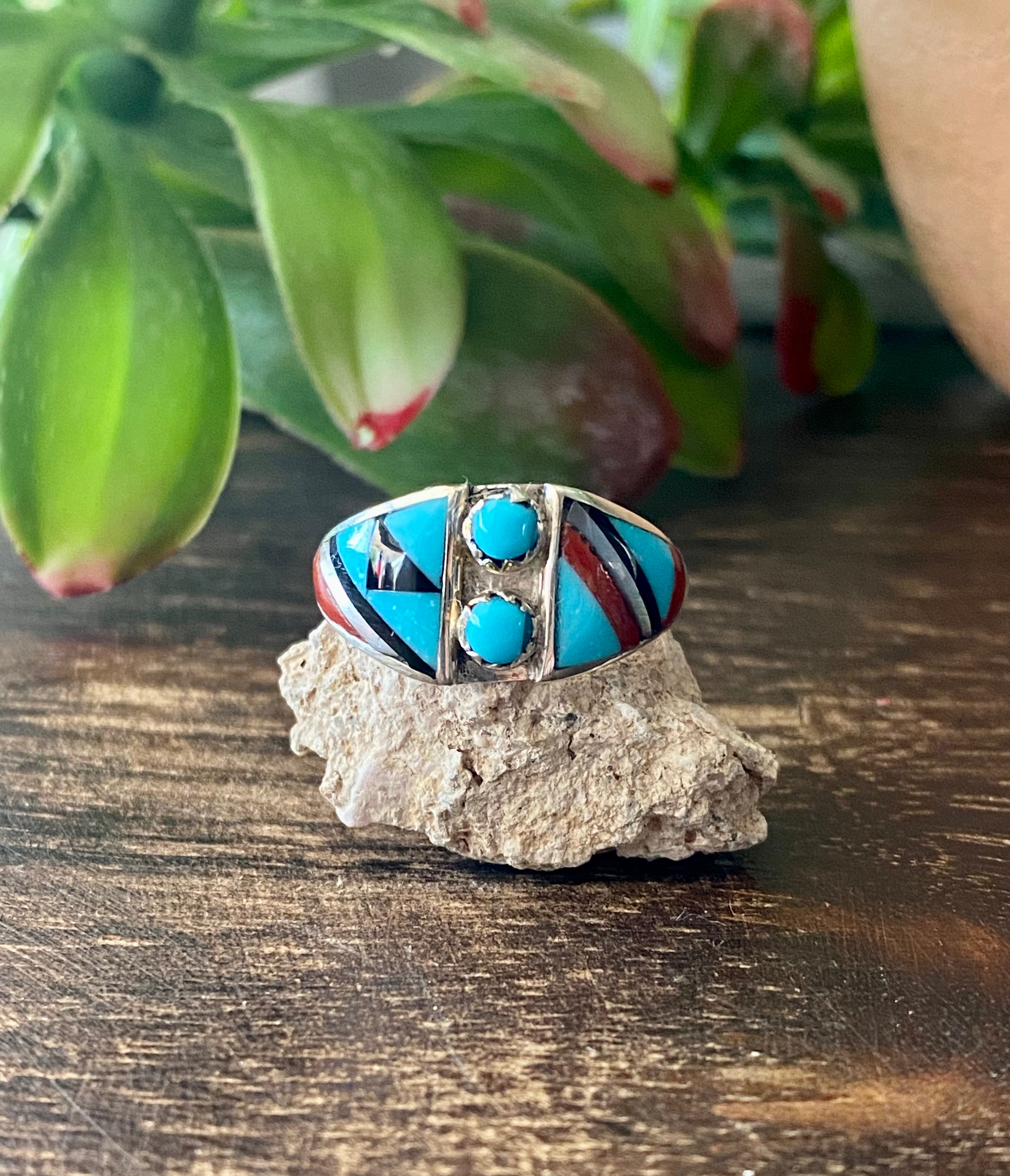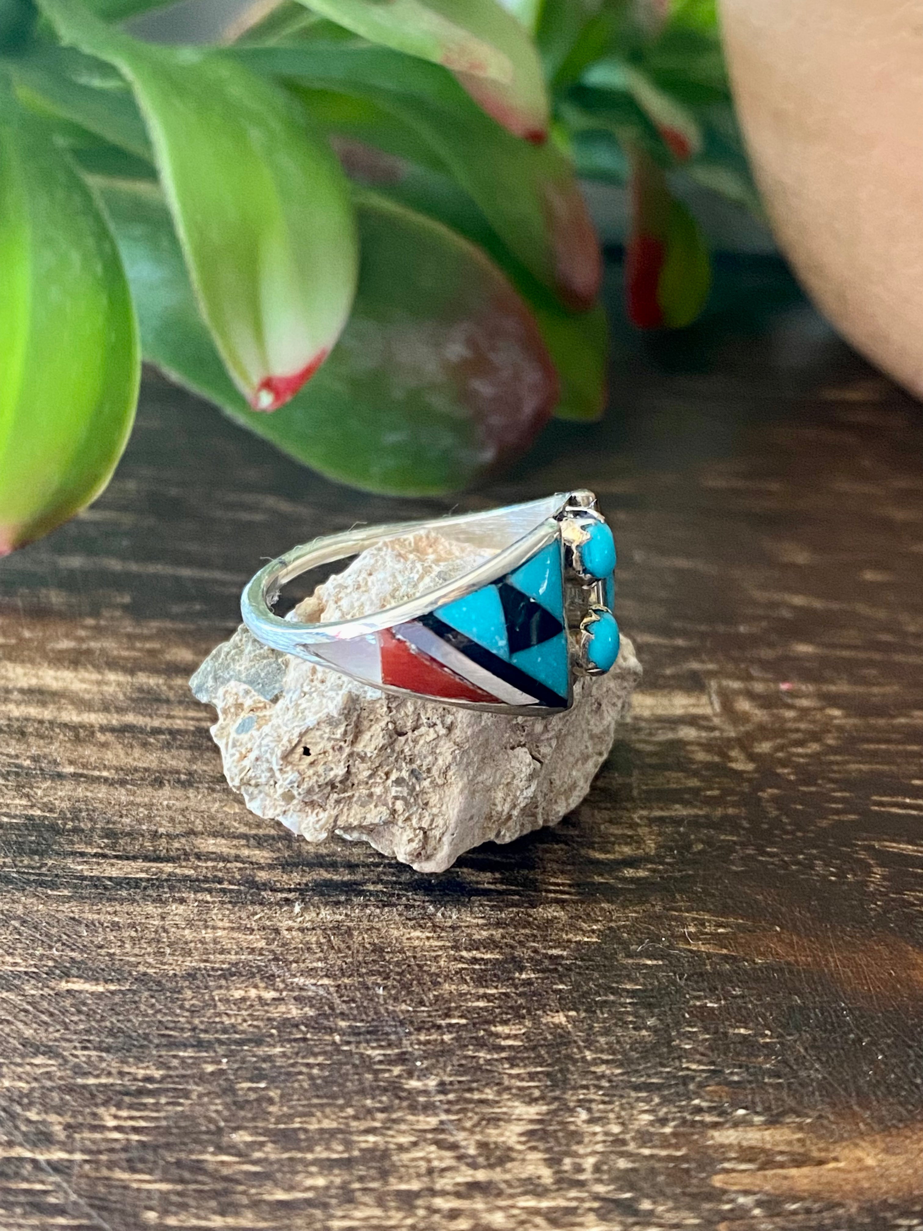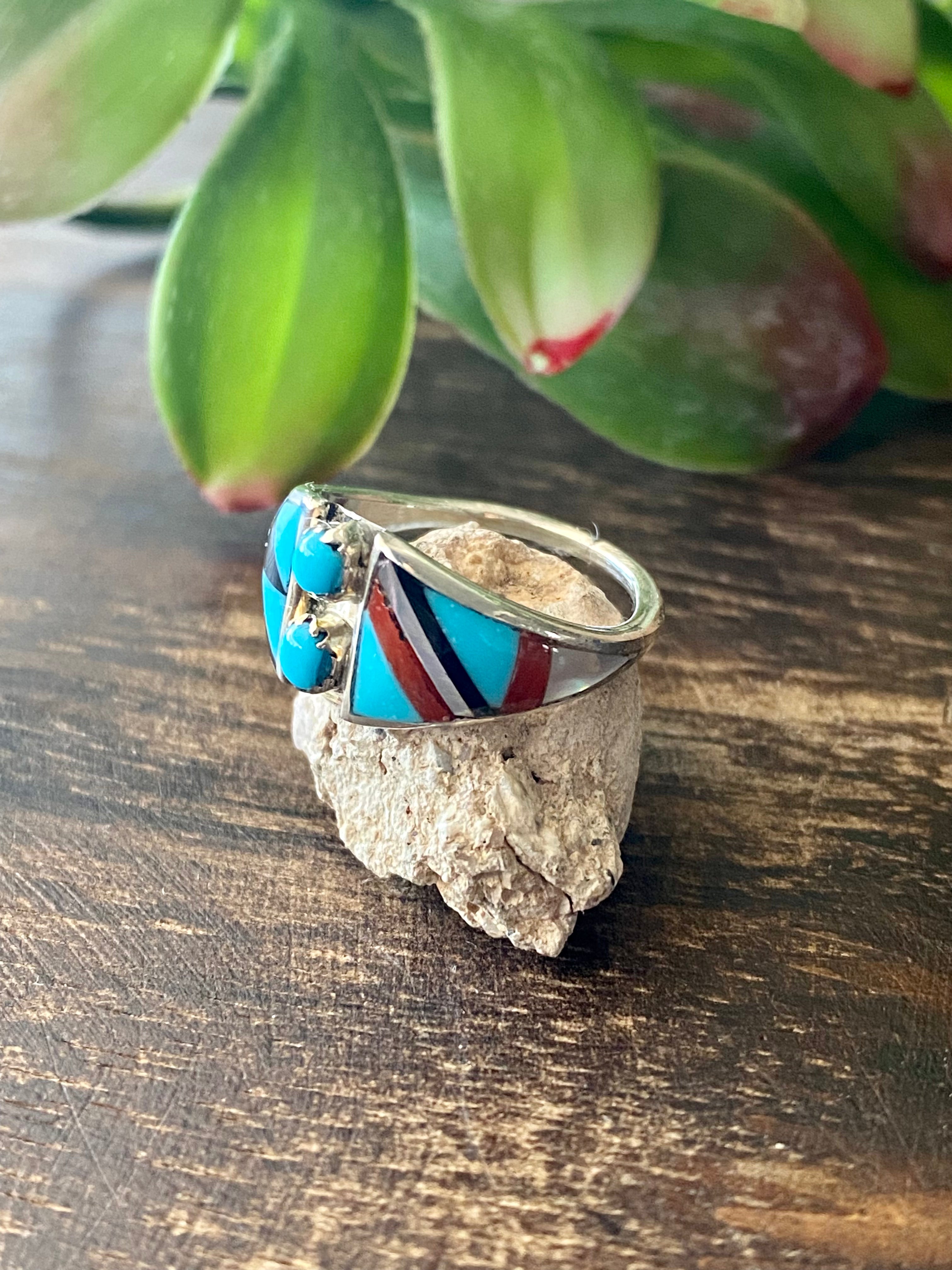 Zuni Made Multi Stone & Sterling Silver Inlay Ring Size 7.5