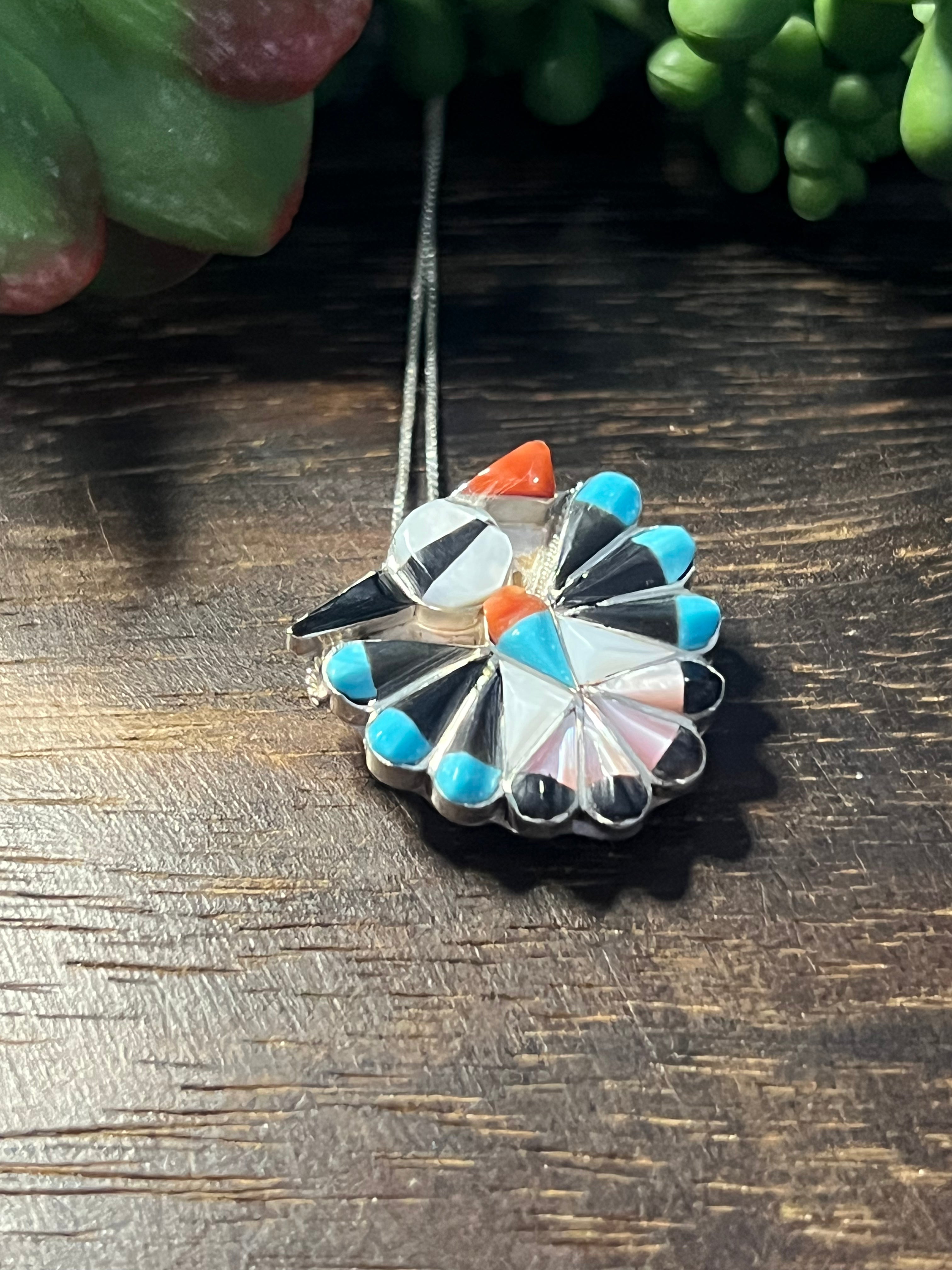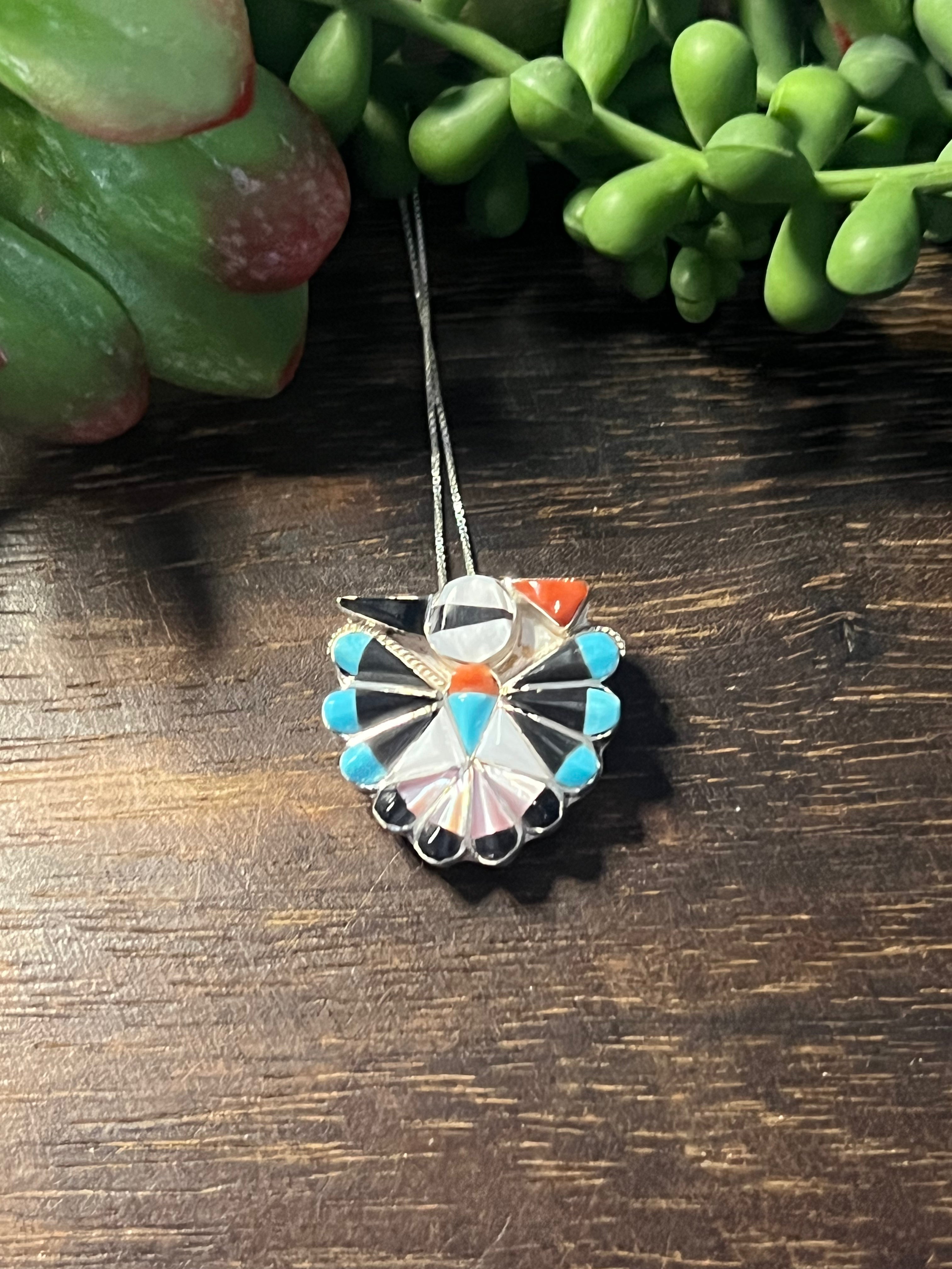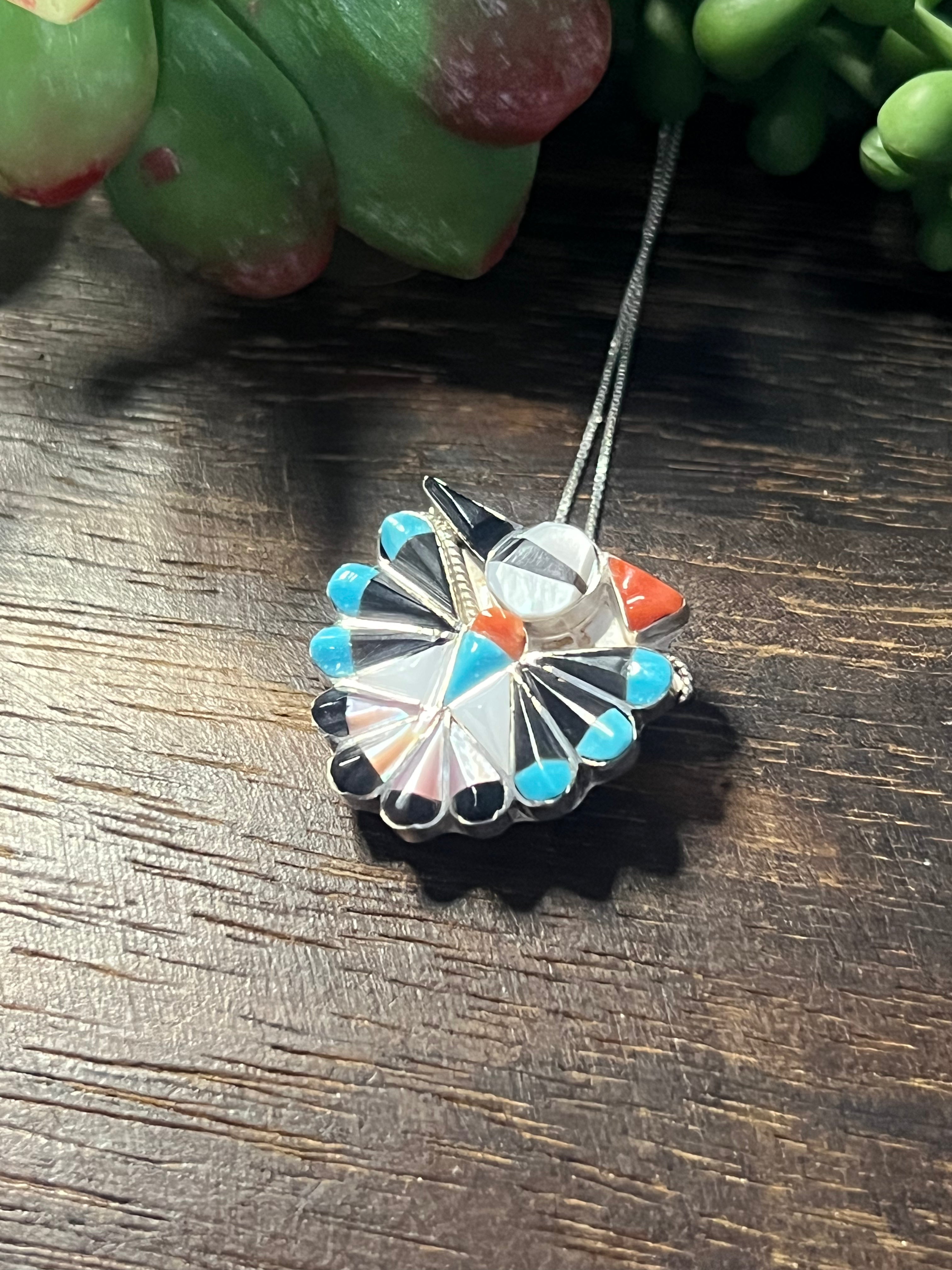 Zuni Made Multi Stone & Sterling Silver Inlay Thunderbird Pendant. It measures just over 1 inch long and 1 inch wide. Pendant Only!! Signed by the artist and stamped sterling silver.