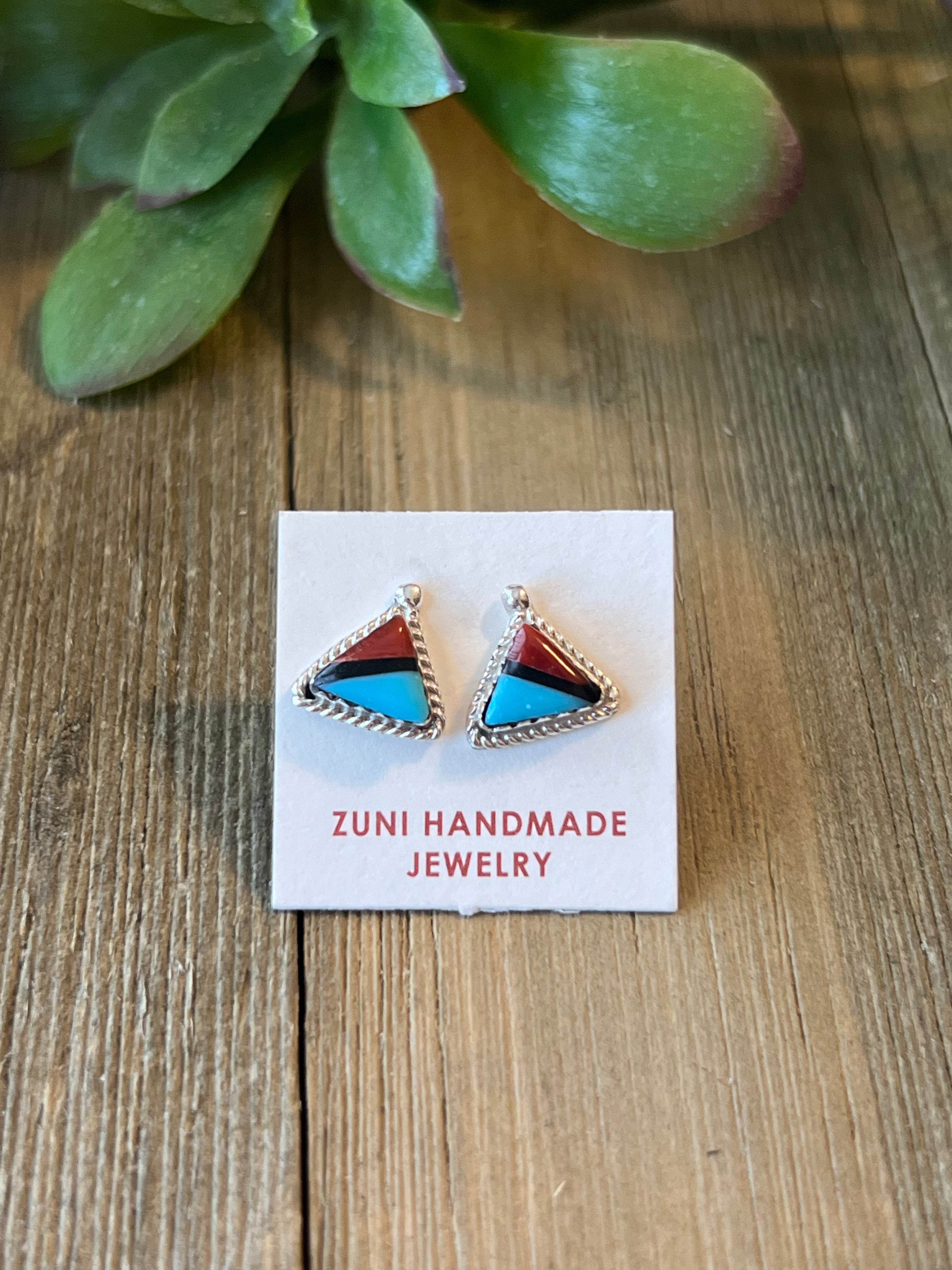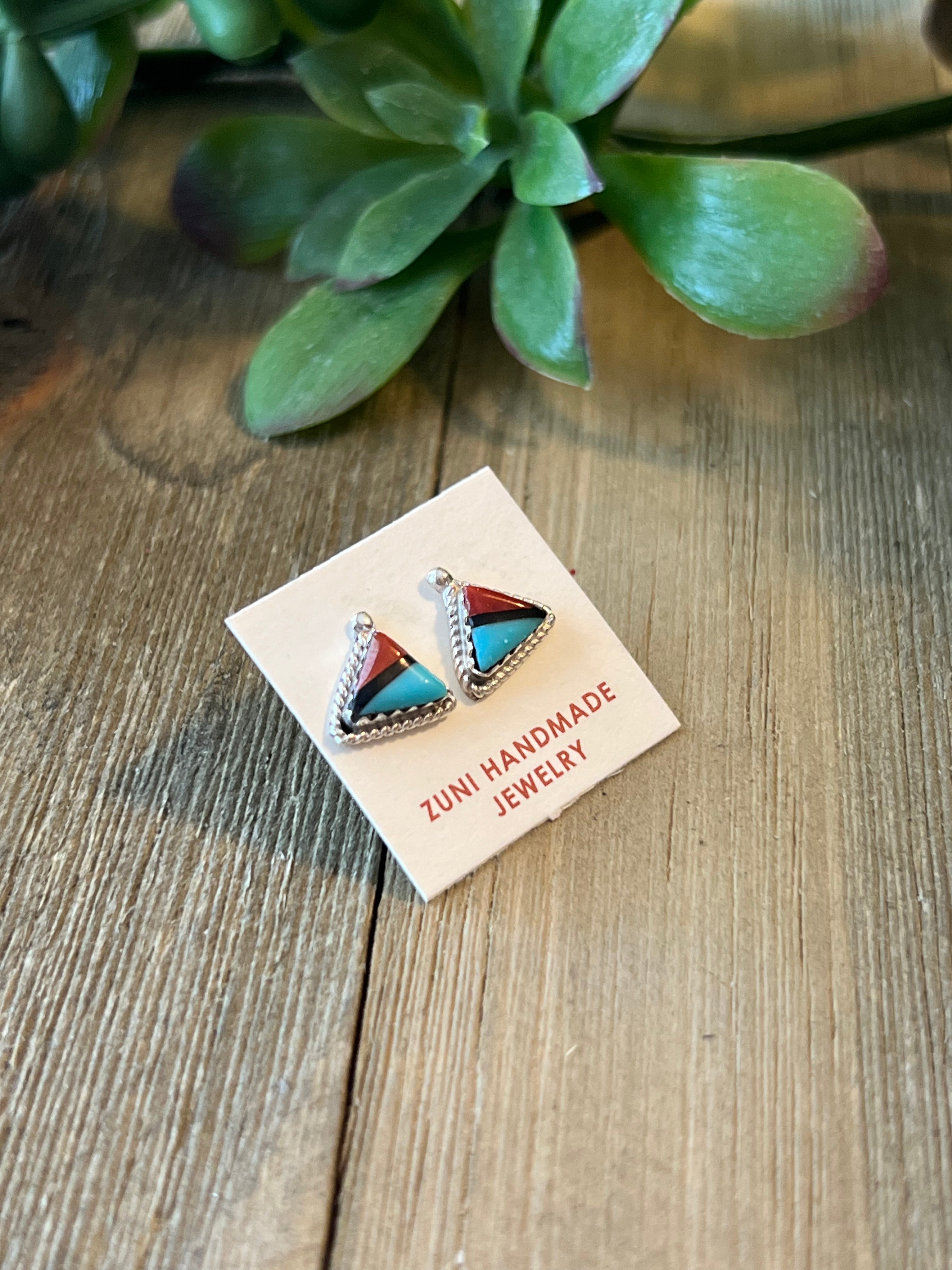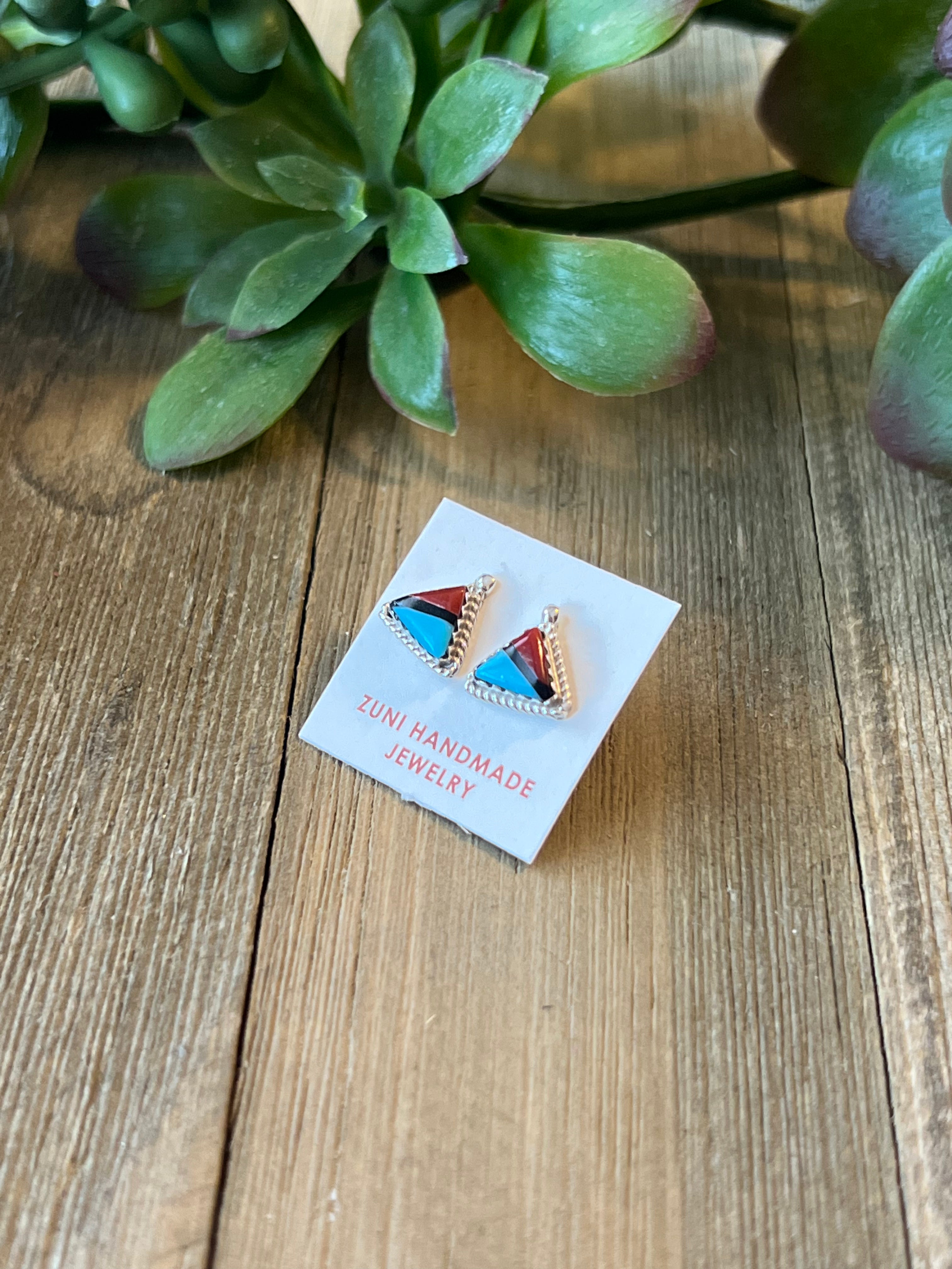 Zuni Made Multi Stone & Sterling Silver Triangle Post Earrings