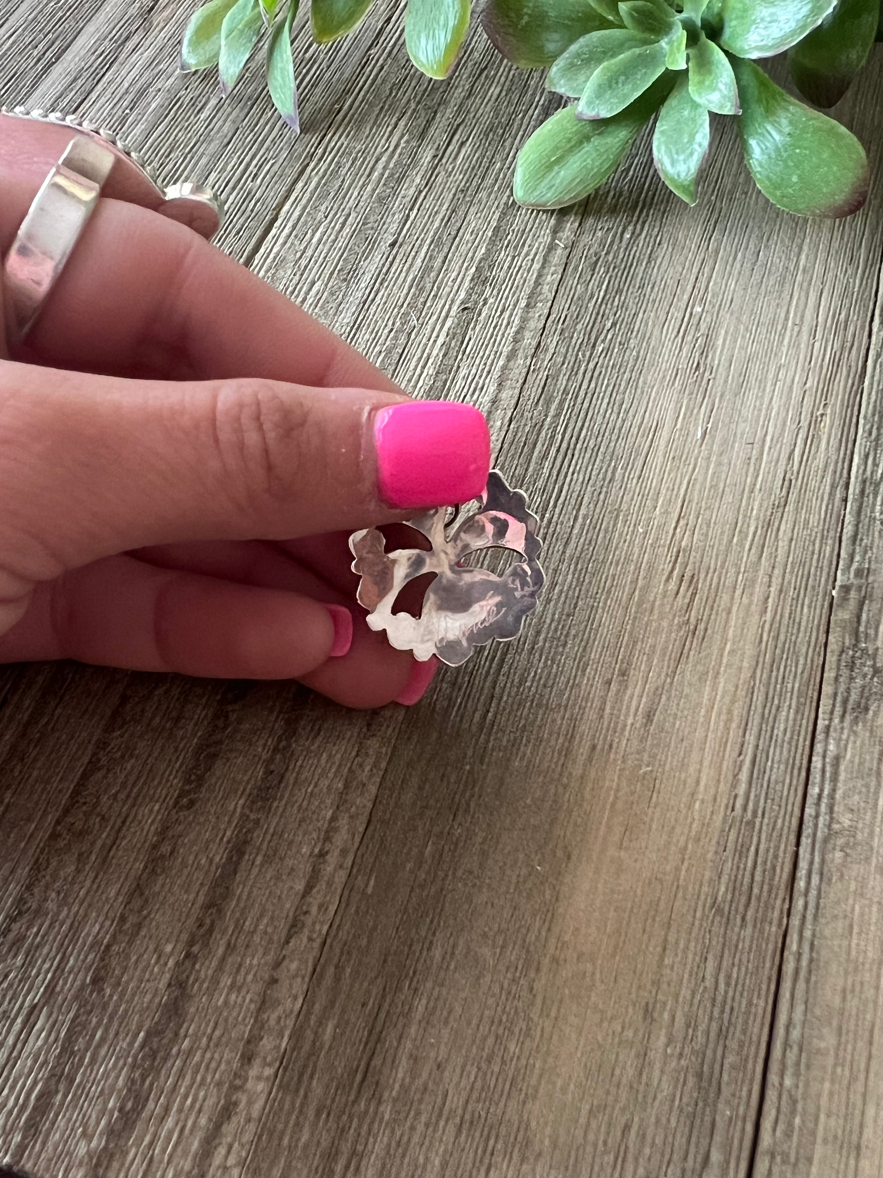 Zuni Made Opal (Man Made) & Sterling Silver Dangle Earrings. It measures 1 1/2 inches long and just over 7/8 of an inch wide. Signed by artist and stamped sterling silver.