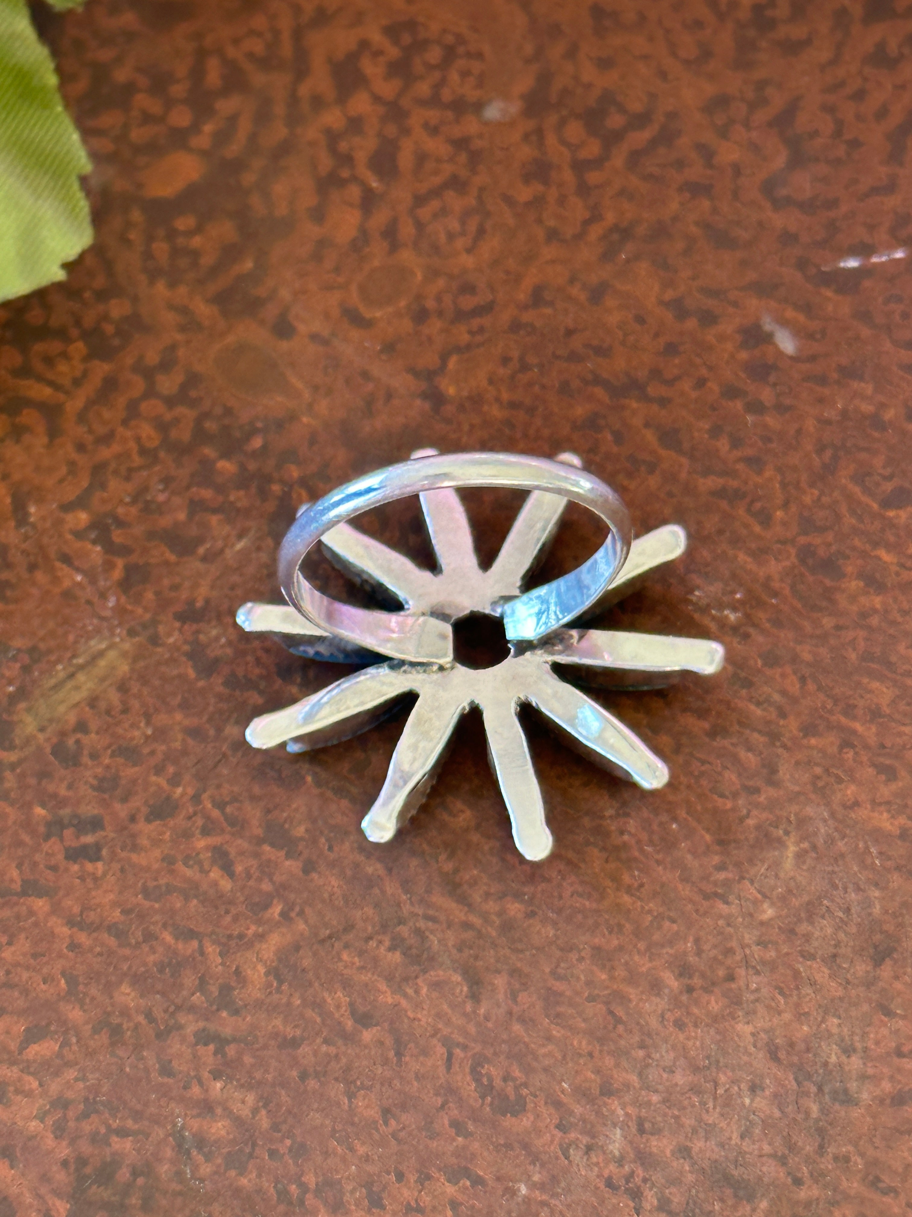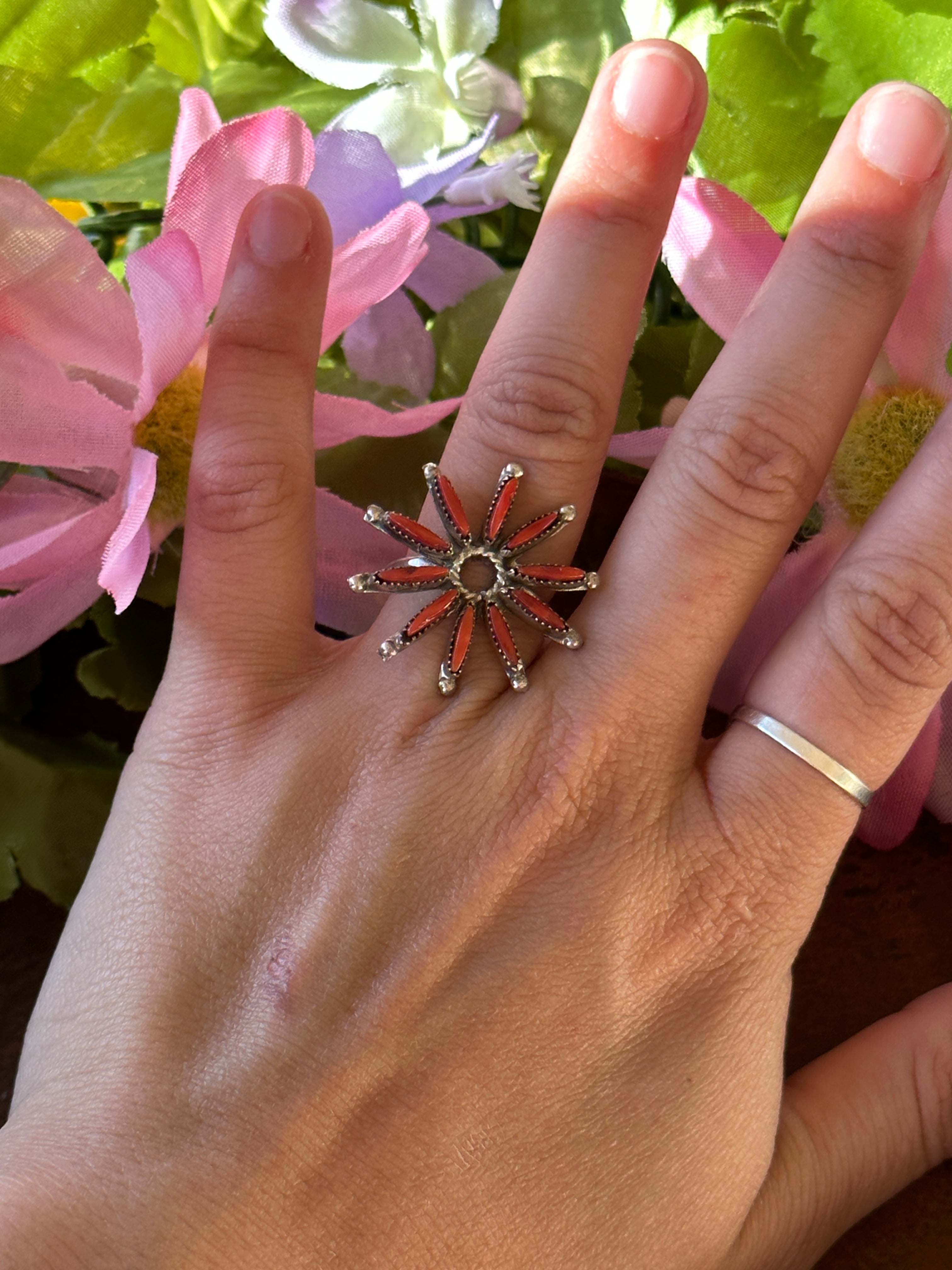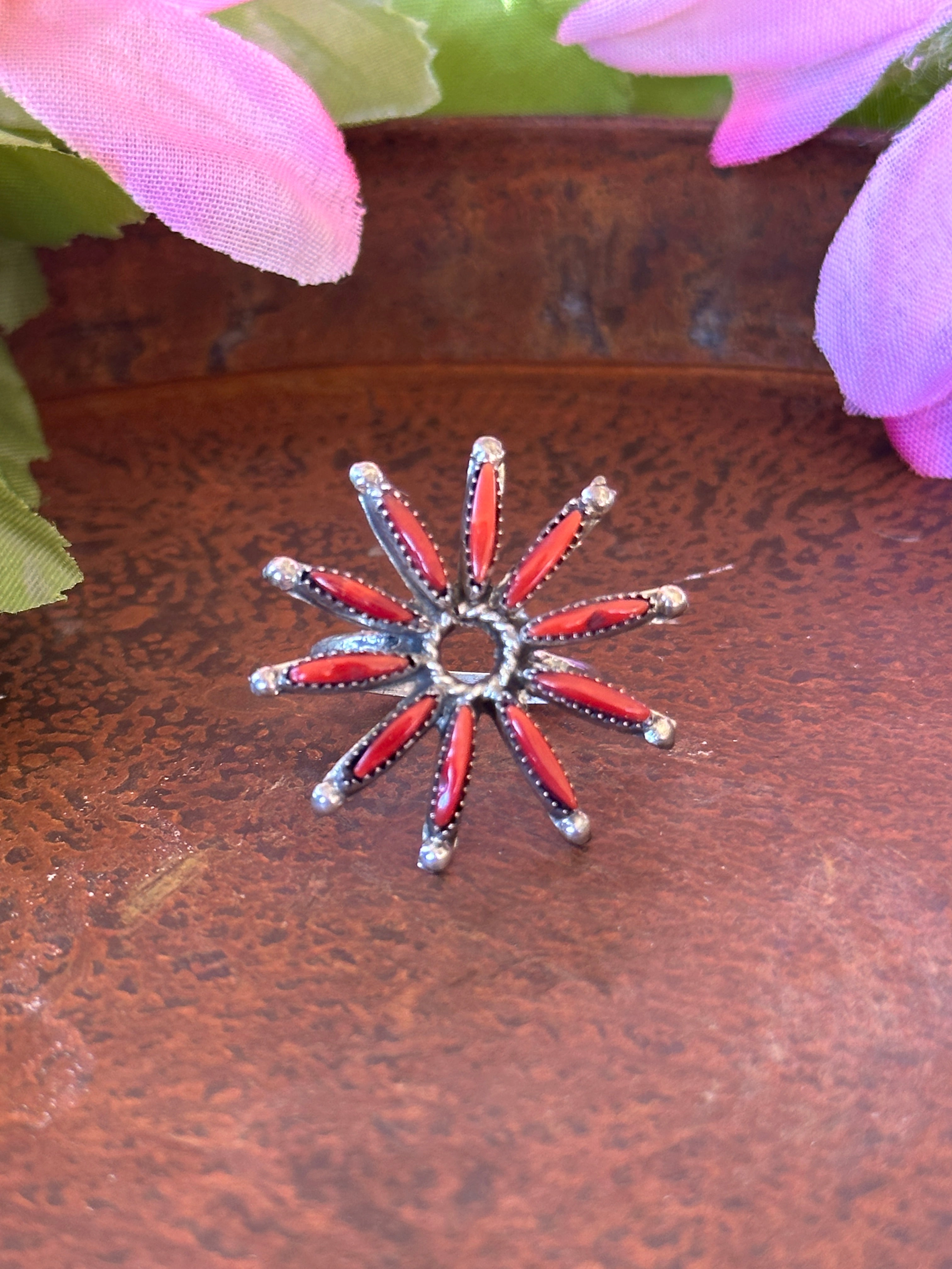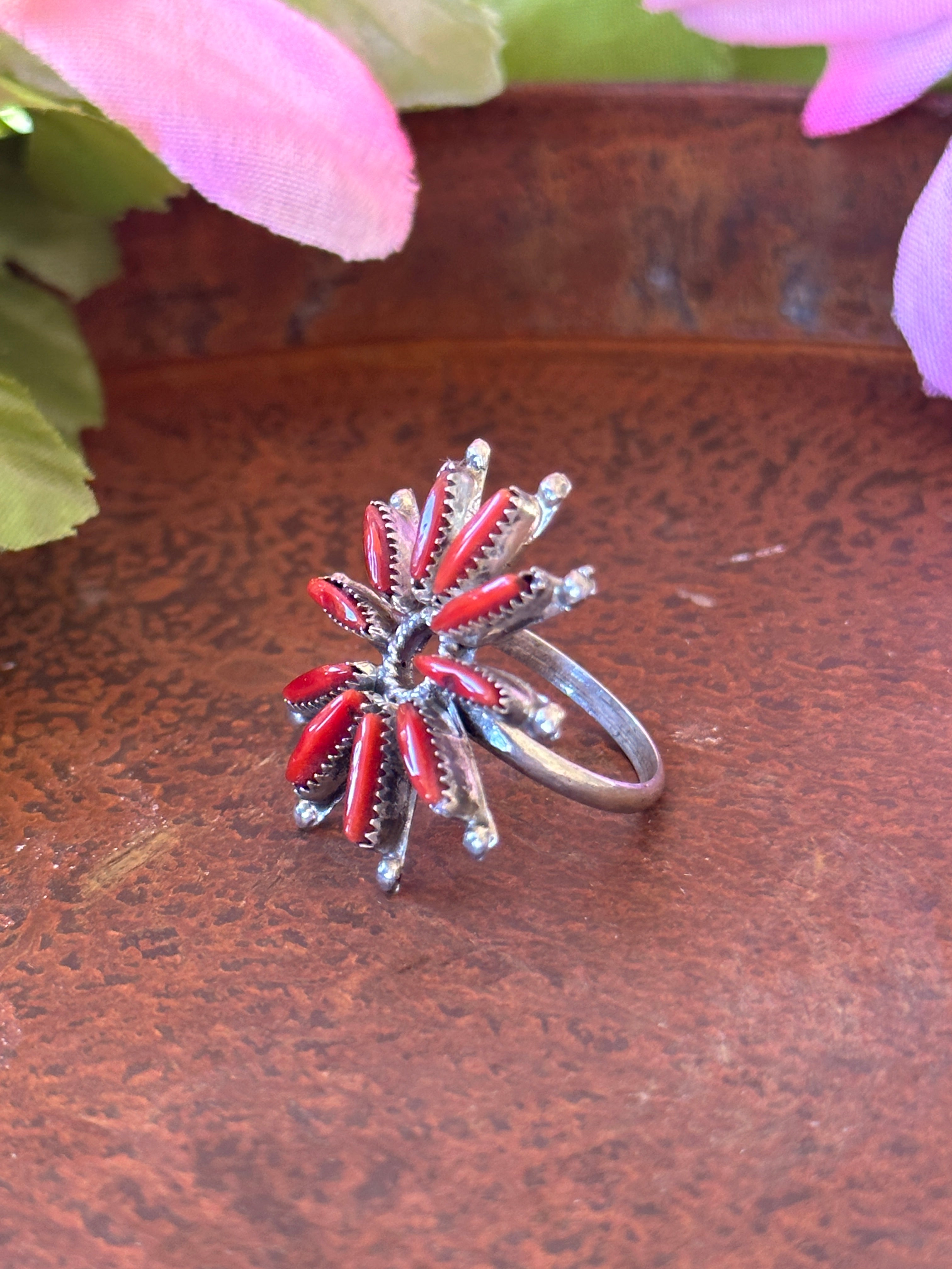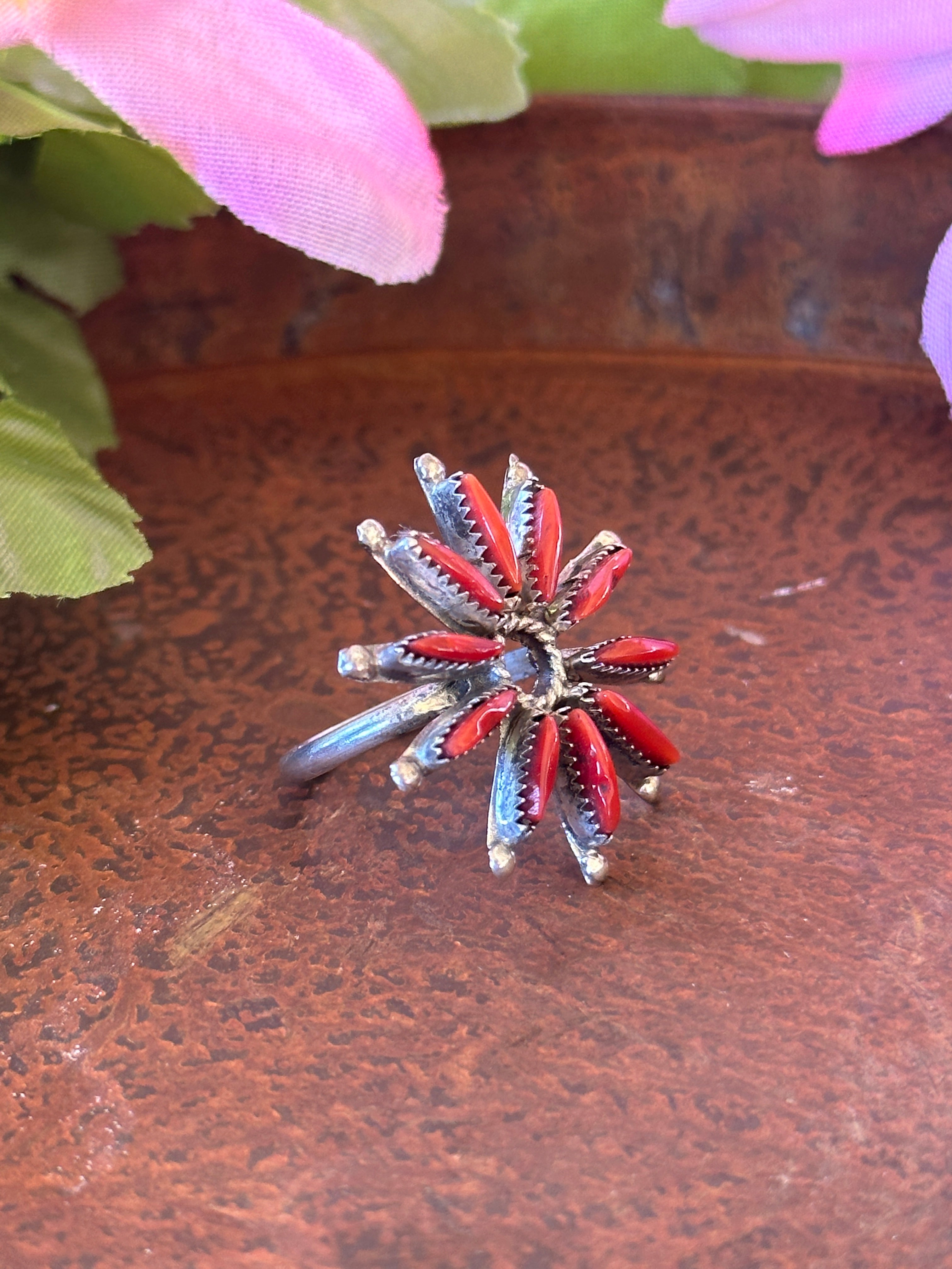 Zuni Made Red Coral & Sterling Silver Ring Size 6