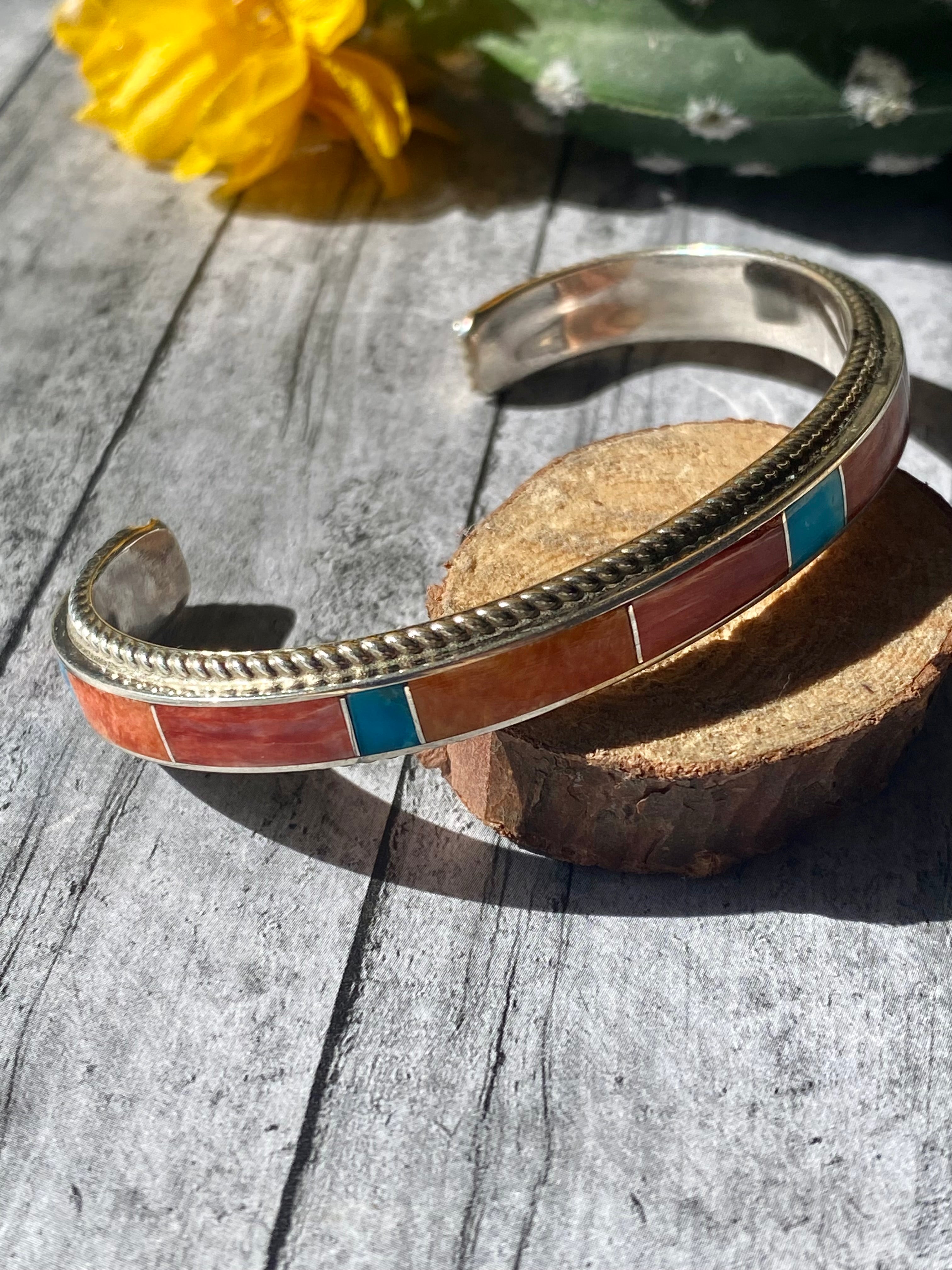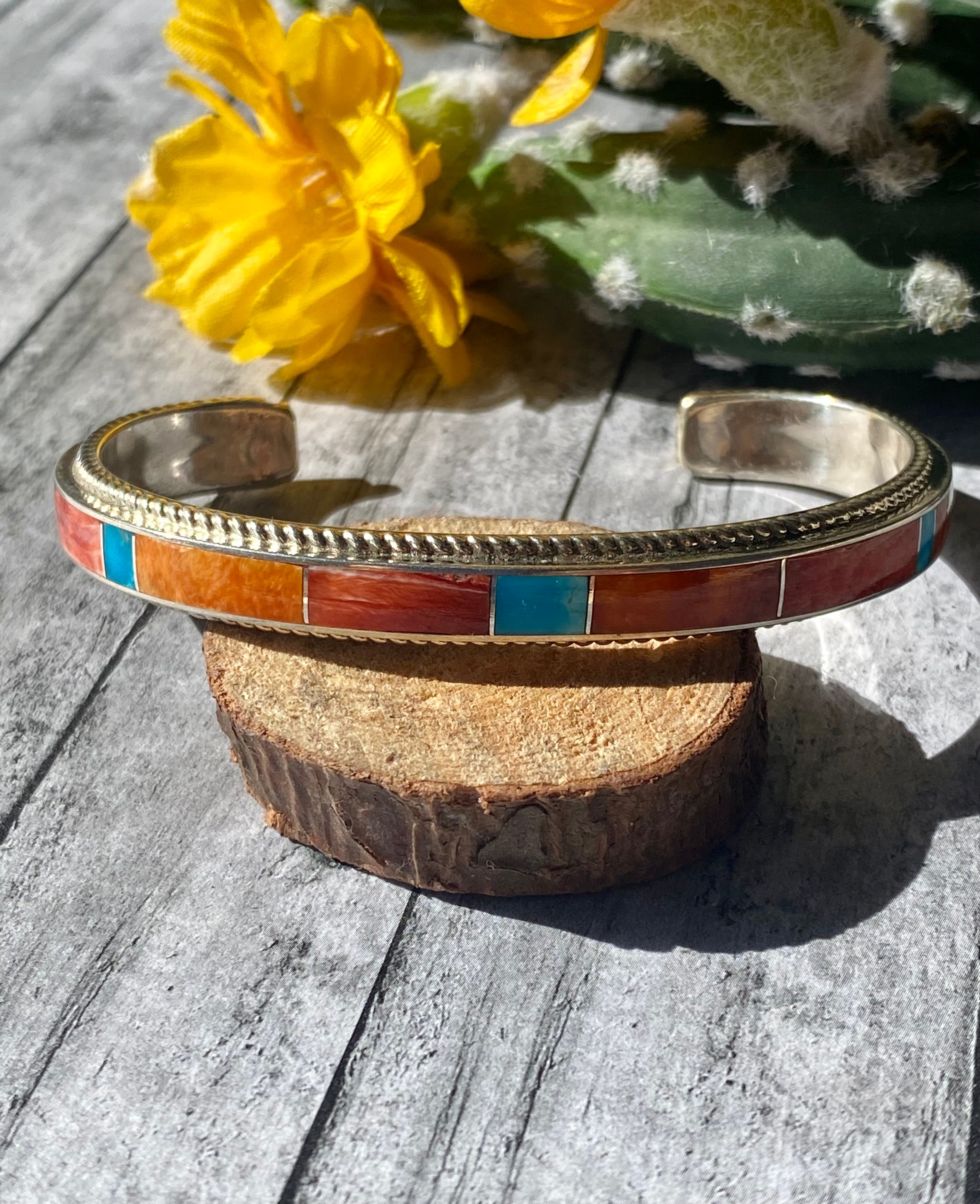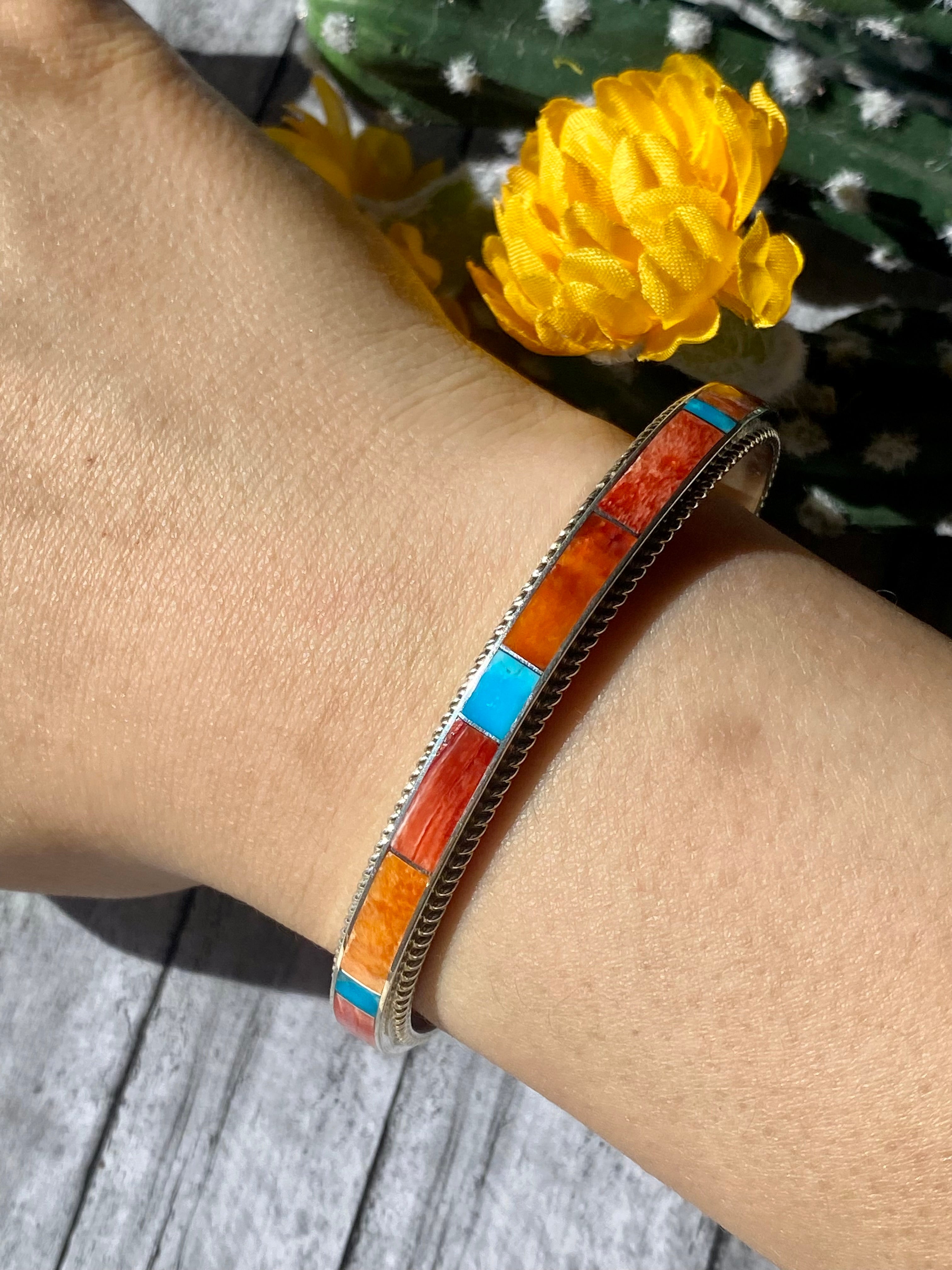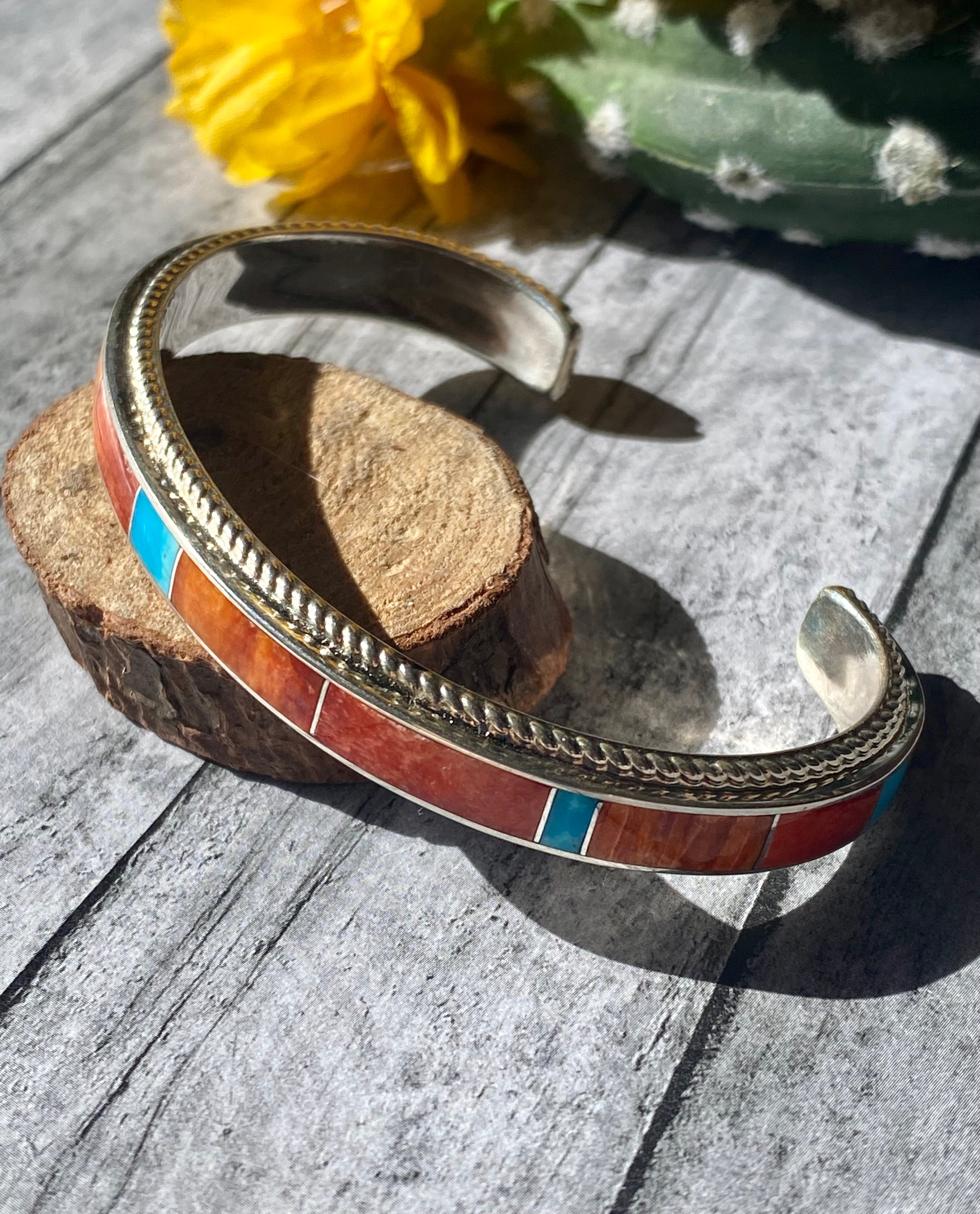 Zuni Made Ricky Boqua Multi Stone & Sterling Silver Inlay Cuff Bracelet. It measures just over 1/4 of inch wide with an inside circumference of 5 1/2 inches and a gap of 1 1/4 inches. Signed by the artist and stamped sterling silver.