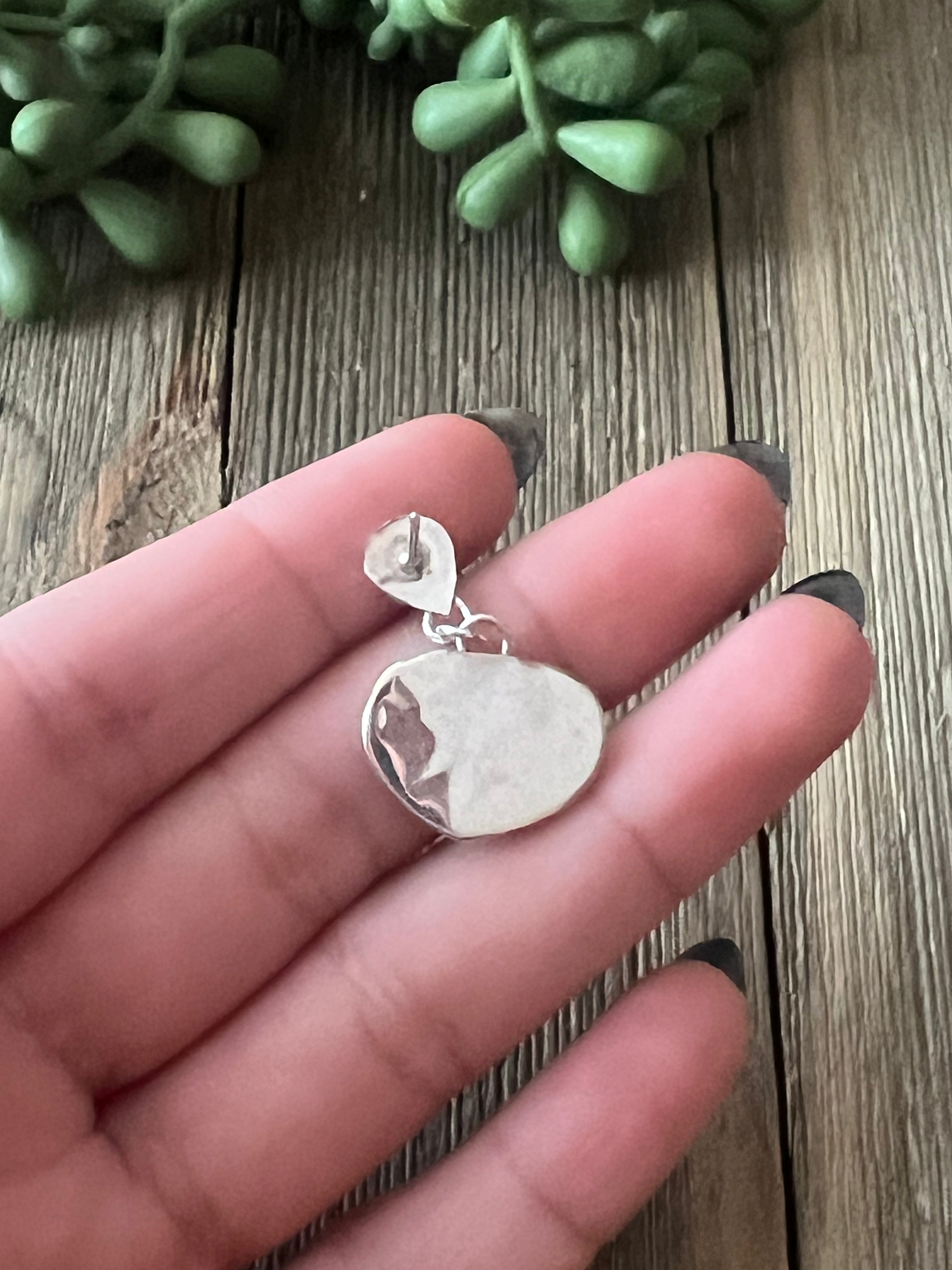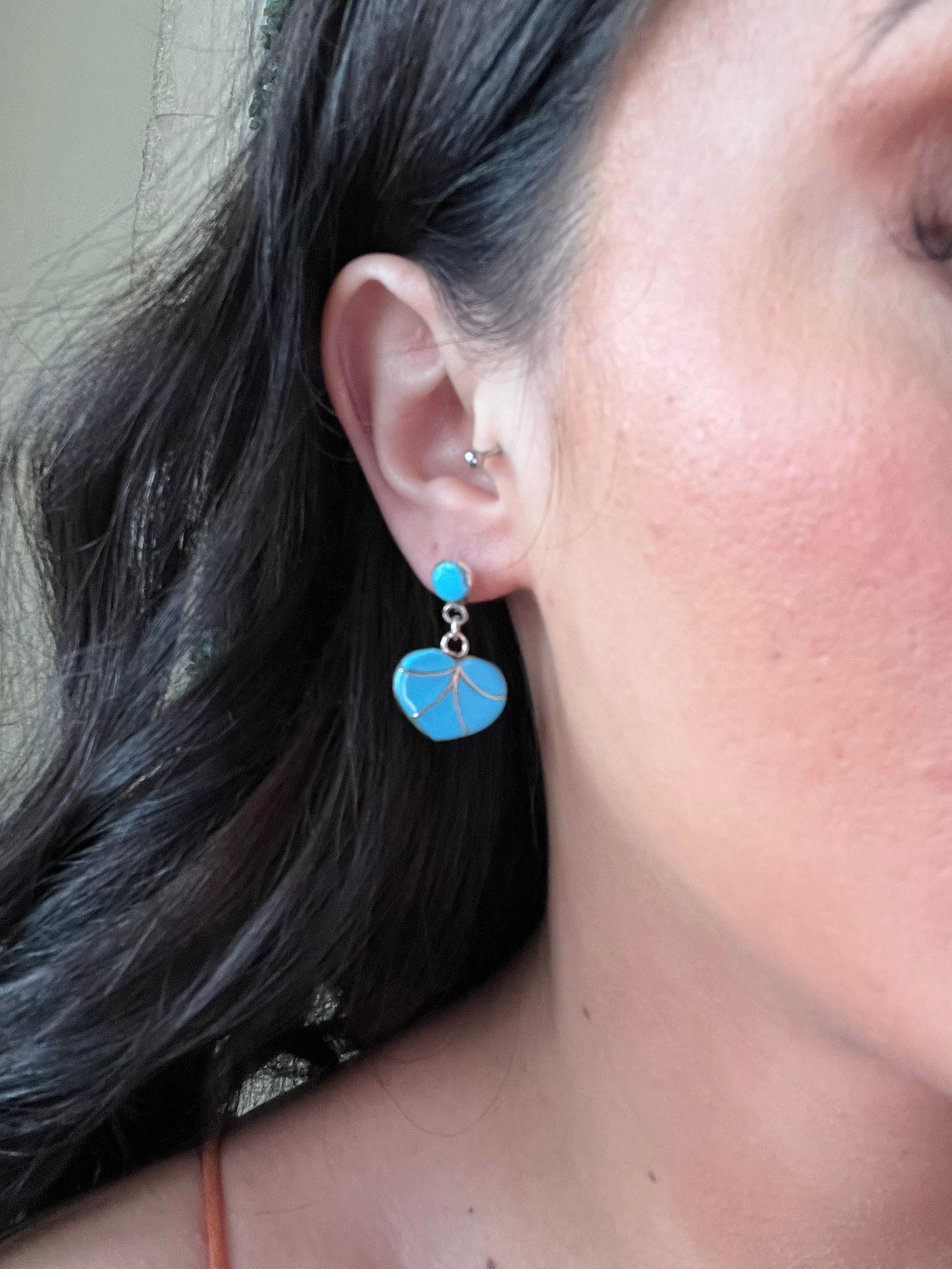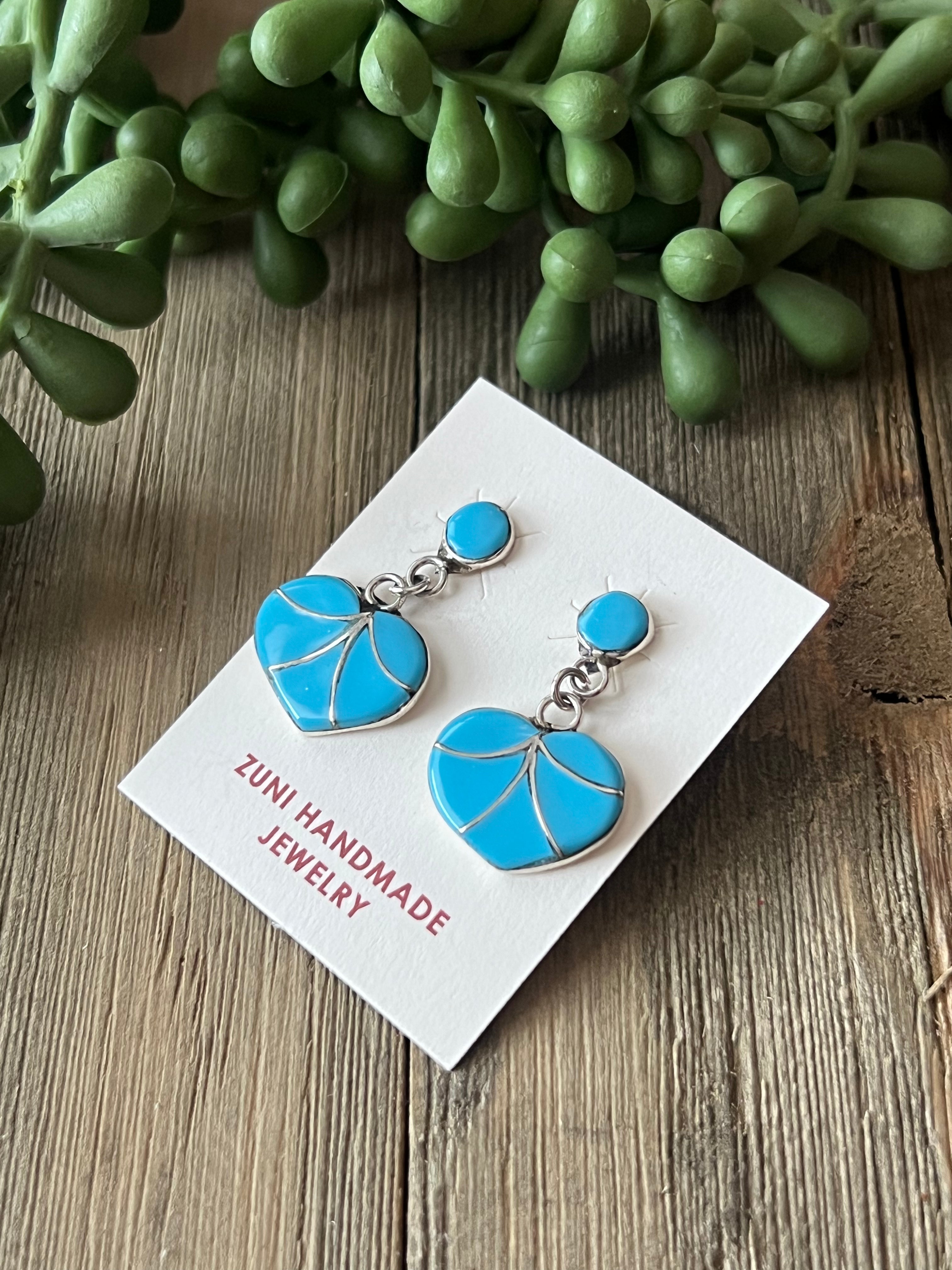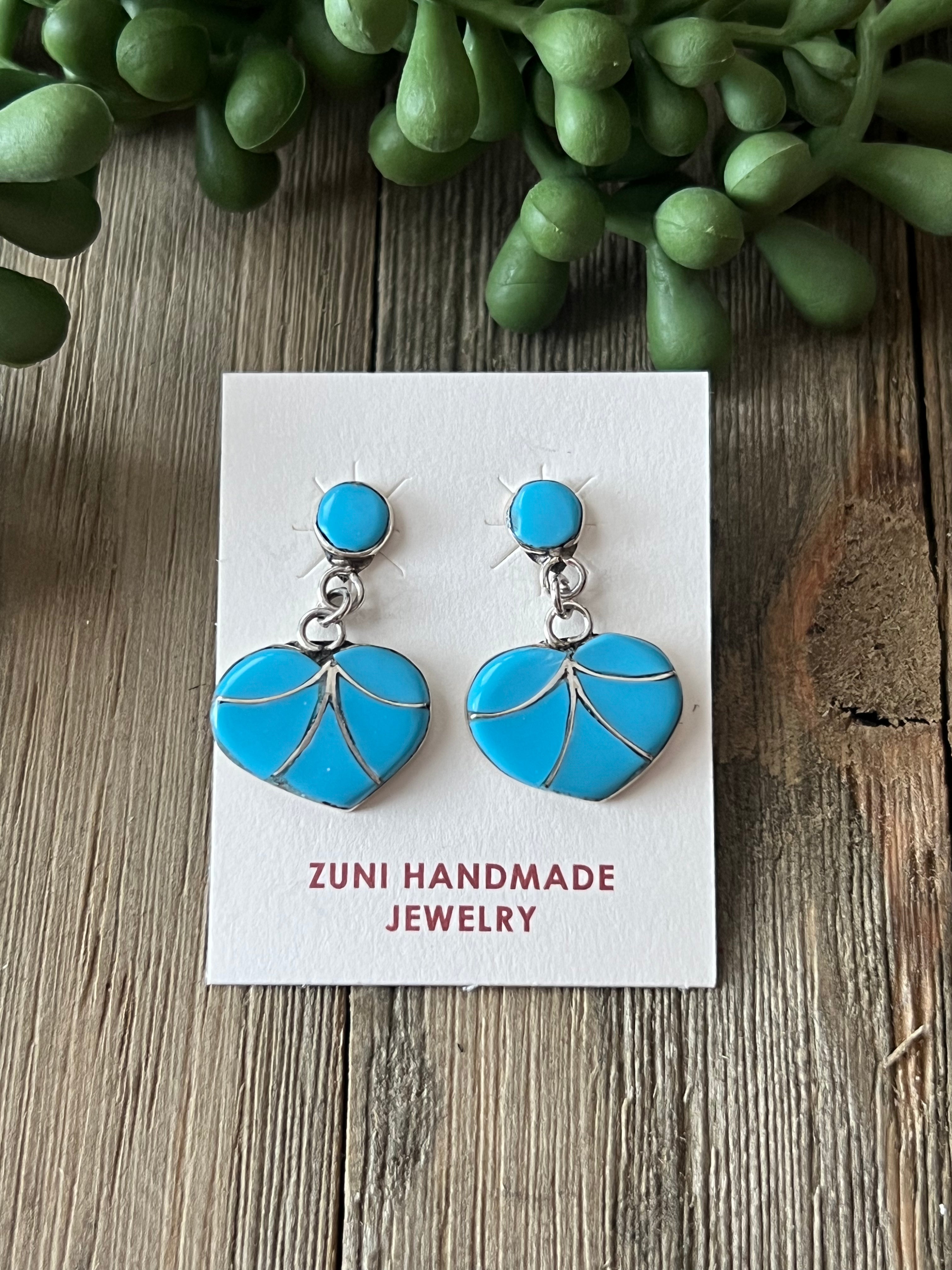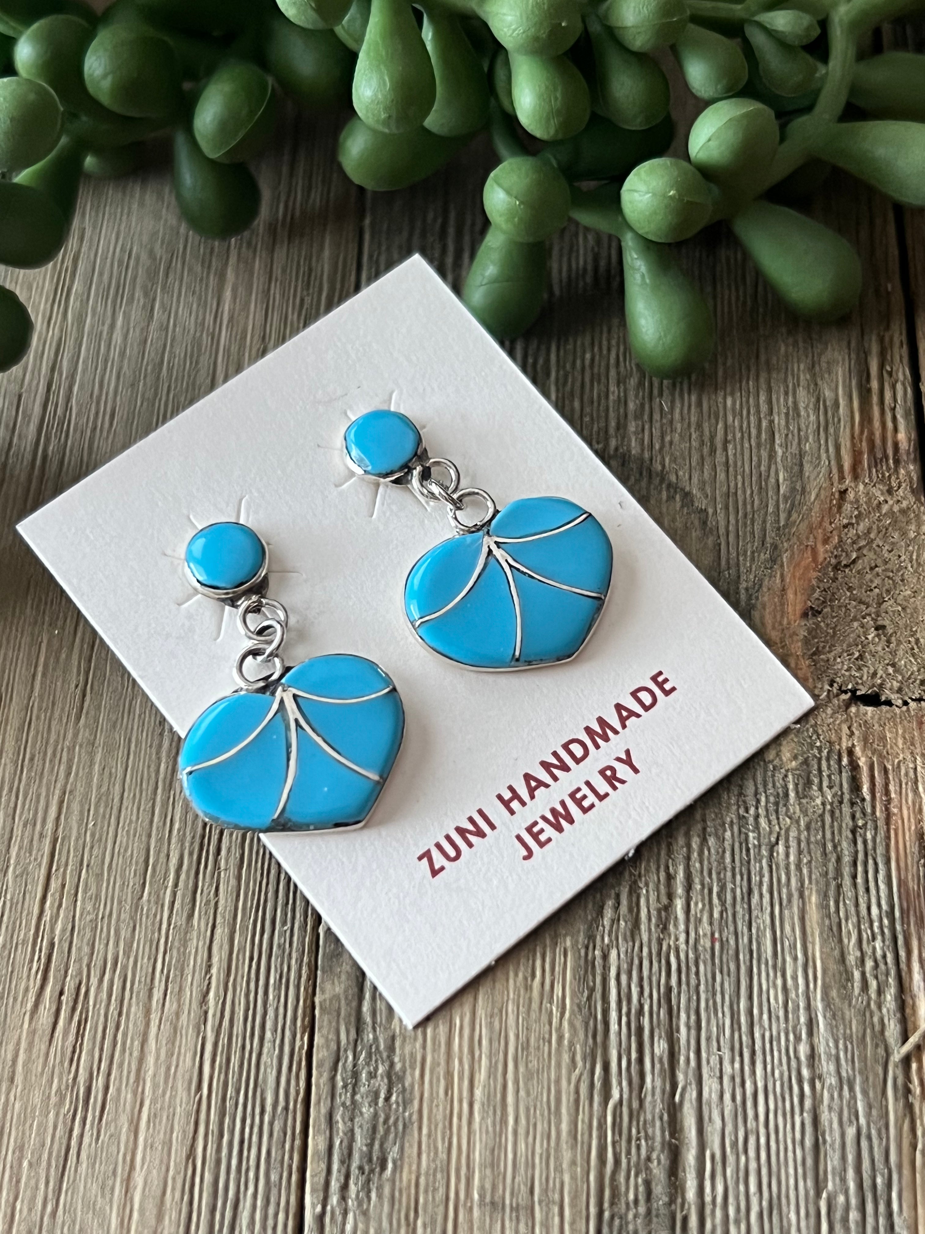 Zuni Made Turquoise & Sterling Silver Inlay Post Heart Dangle Earrings