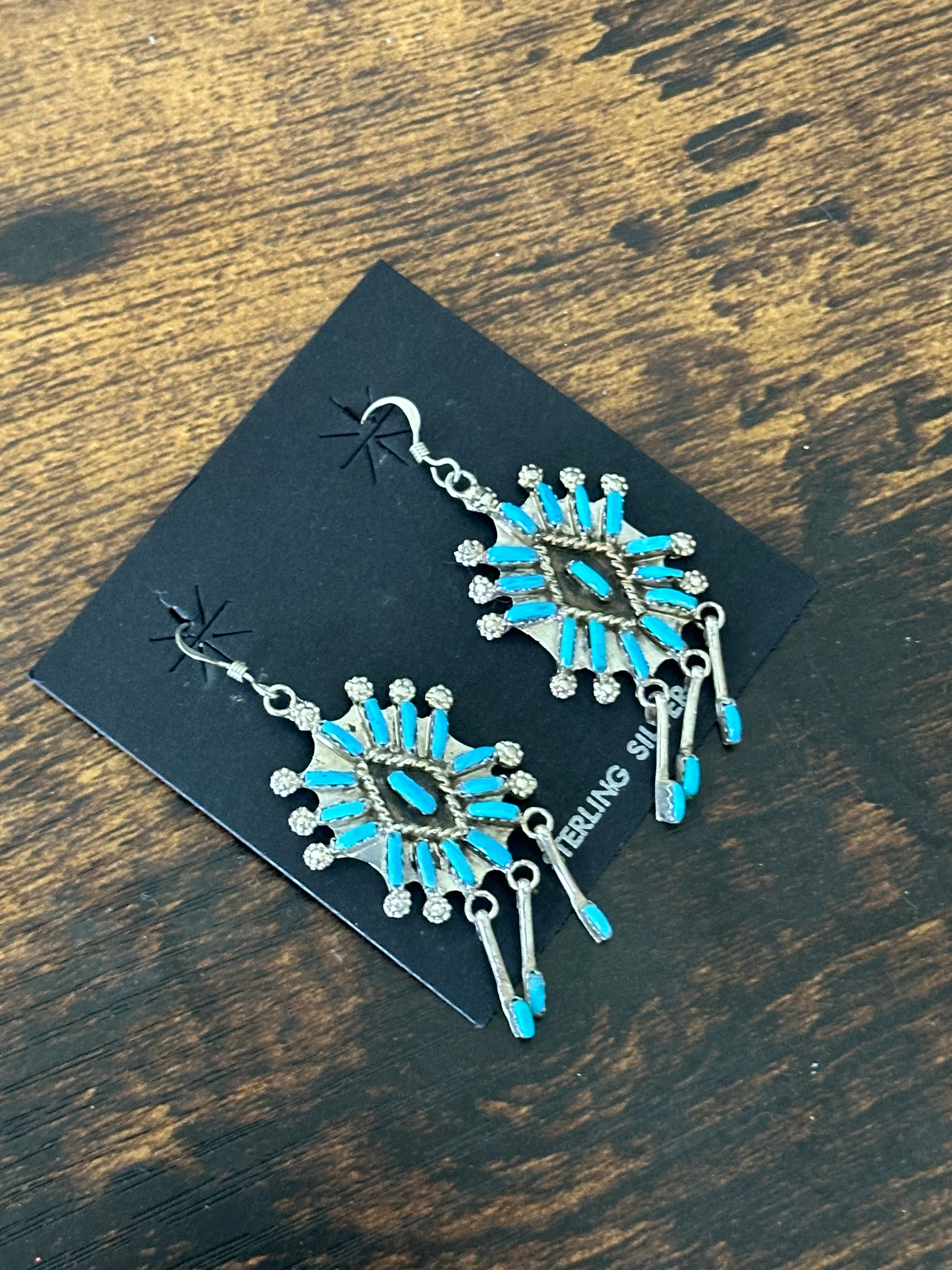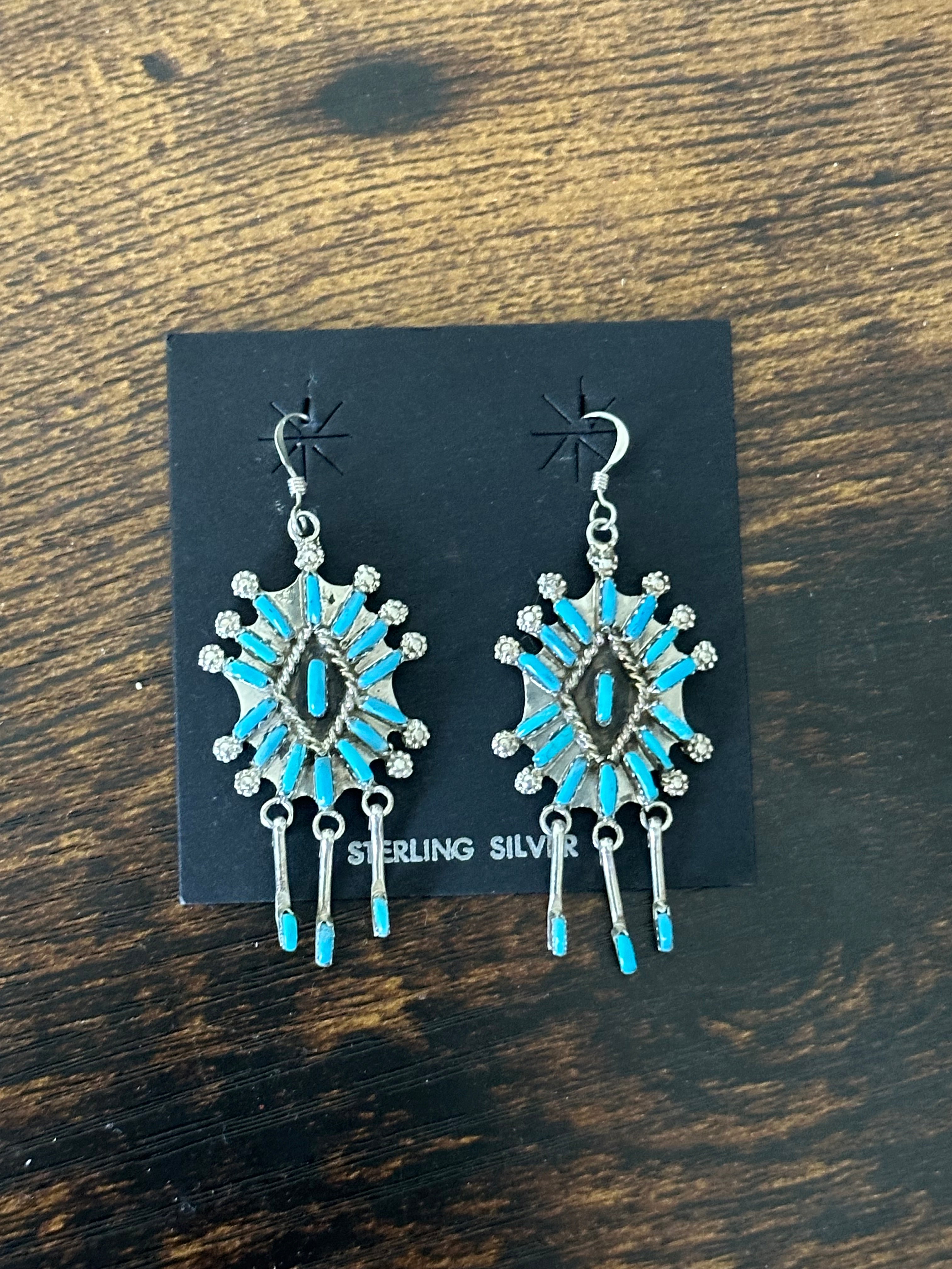 Beautiful necklace. Zuni Made Turquoise & Sterling Silver Needlepoint Necklace Set. It measures 24 inches long with hang while the chain by itself measures 20 inches long. Signed by the artist and stamped sterling silver.