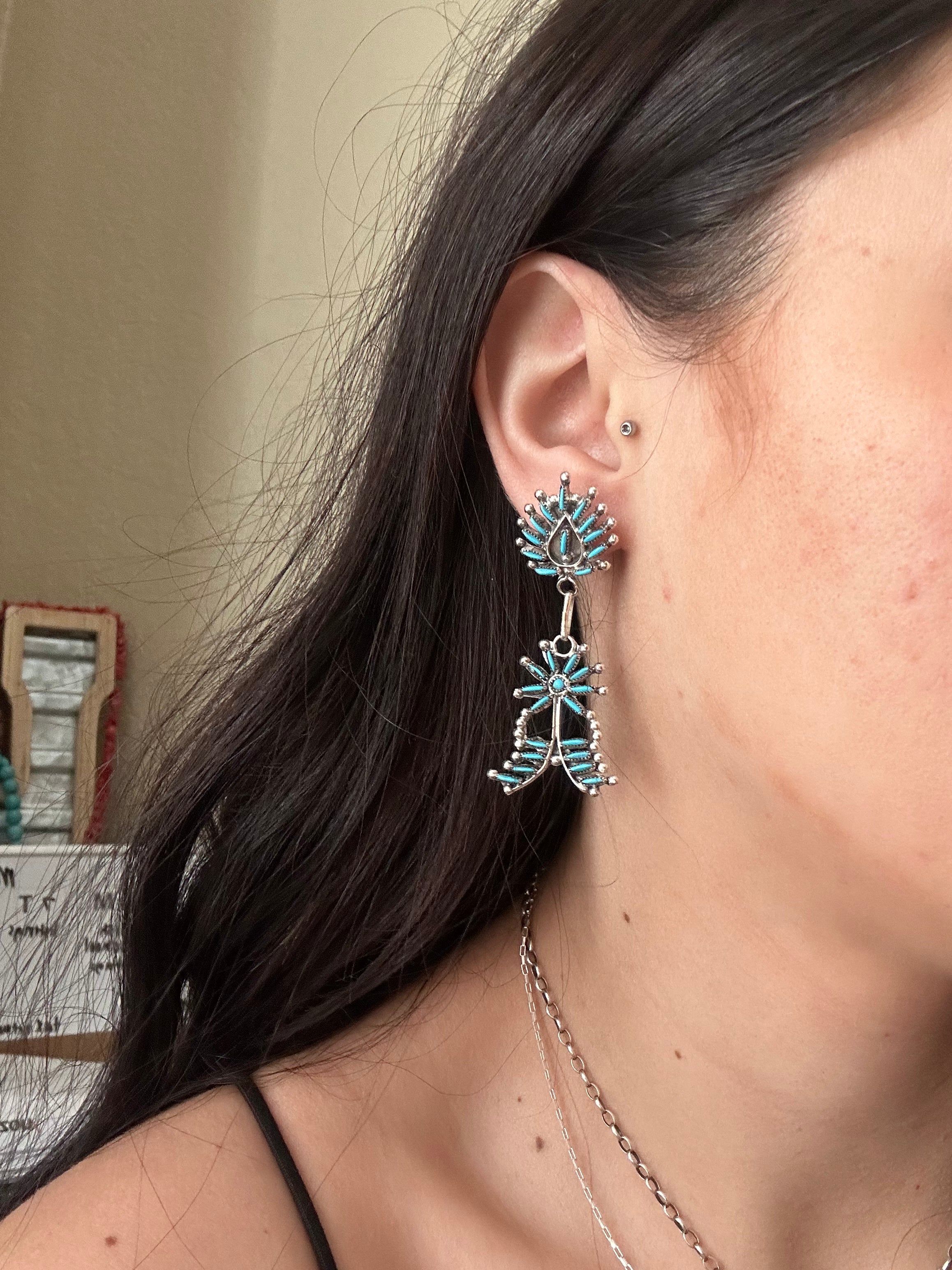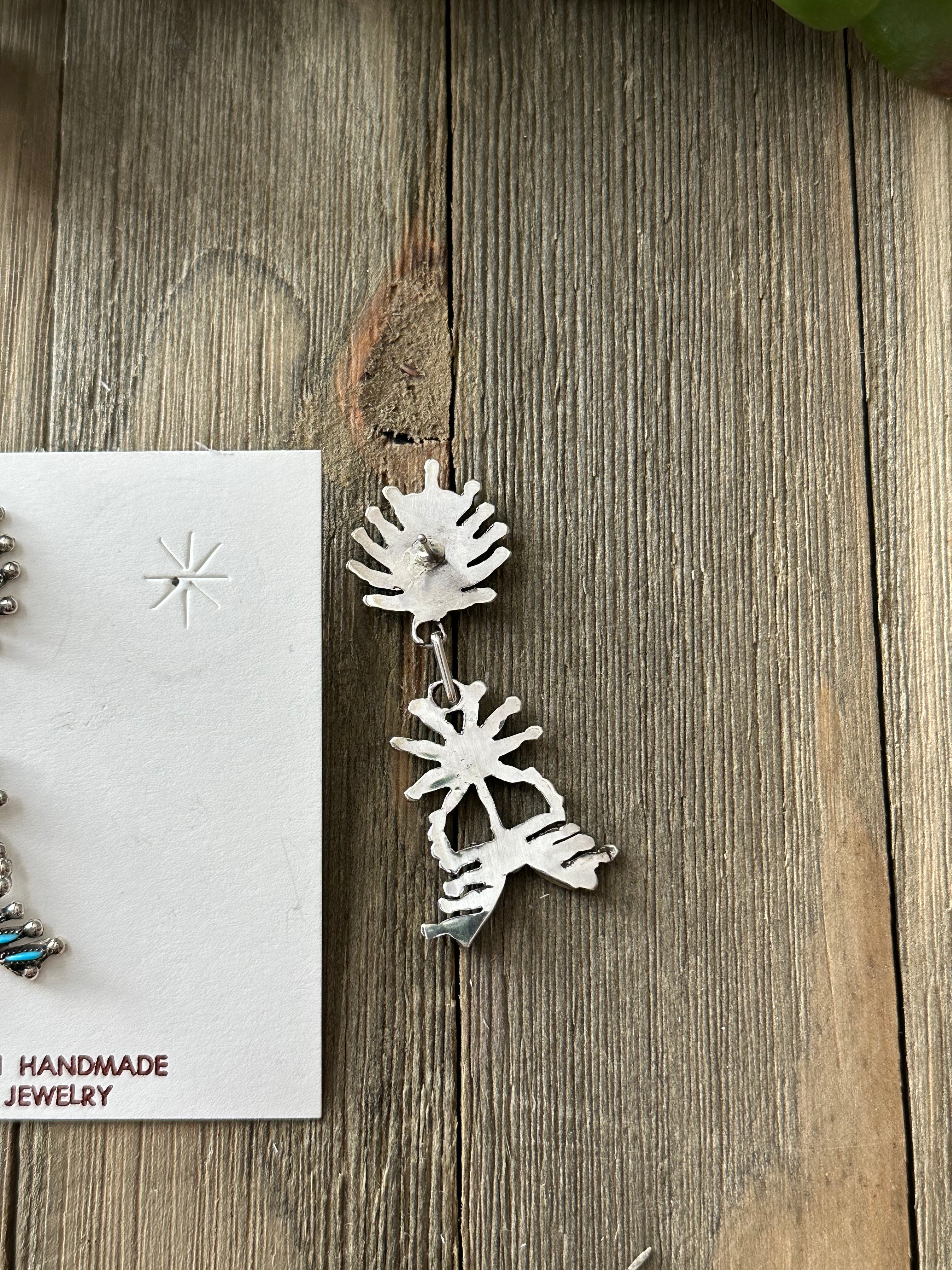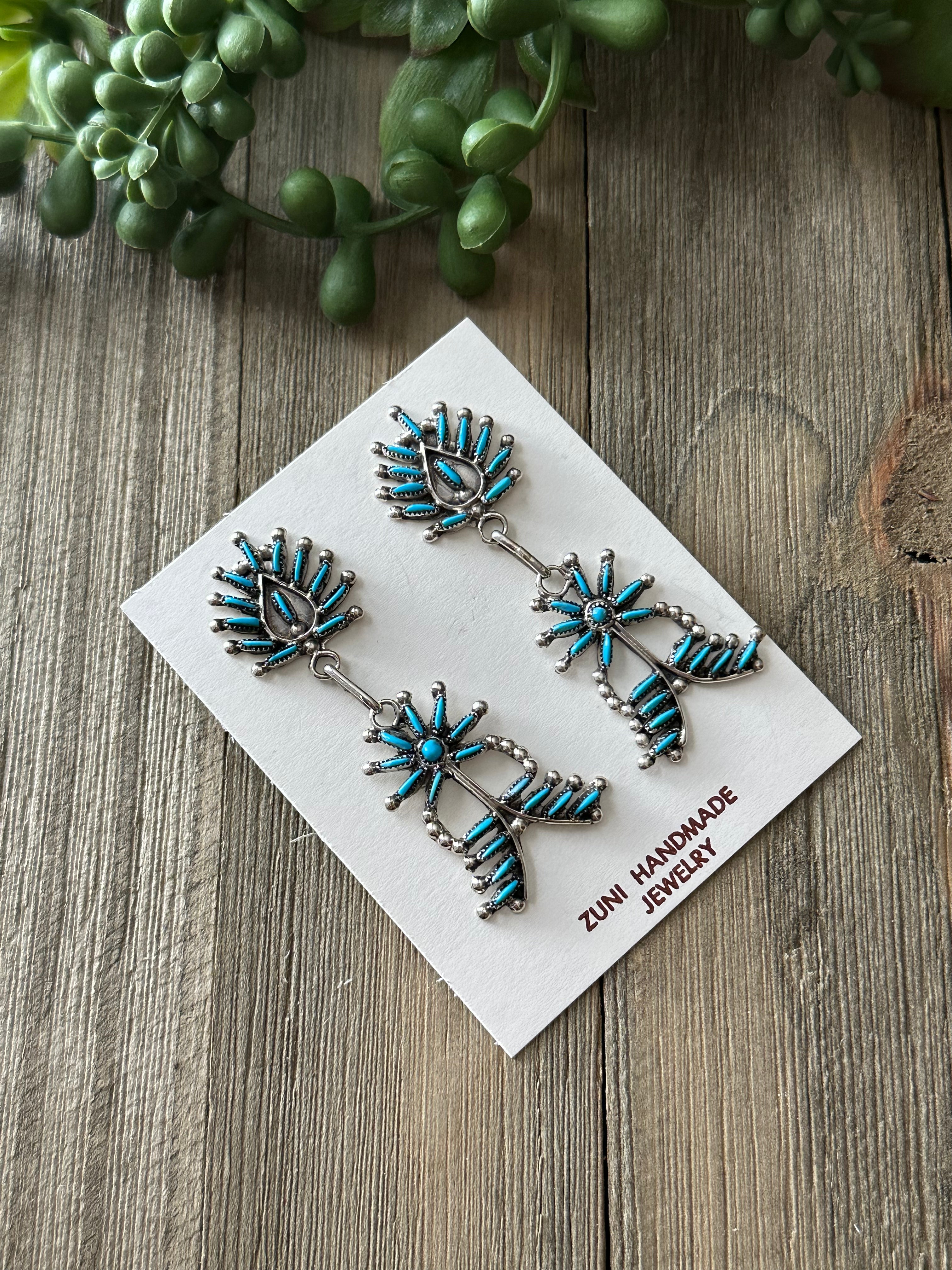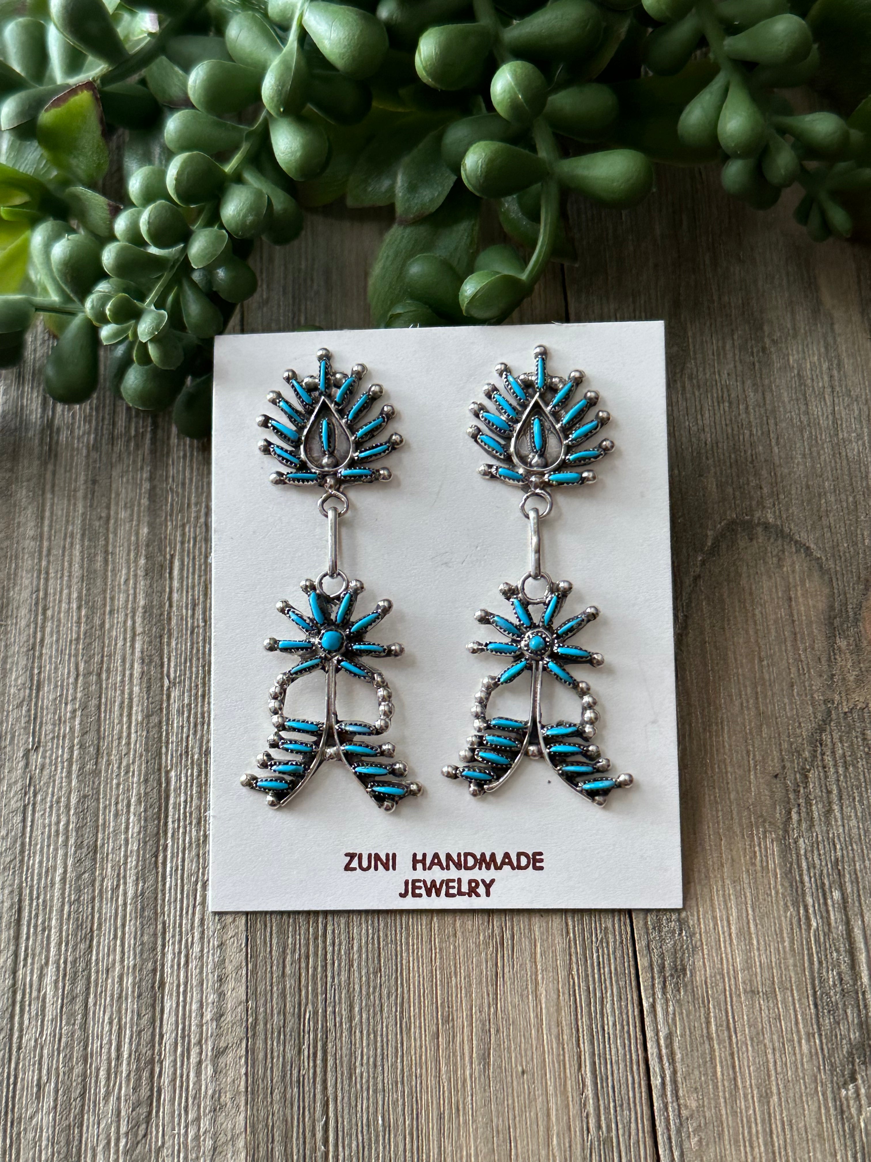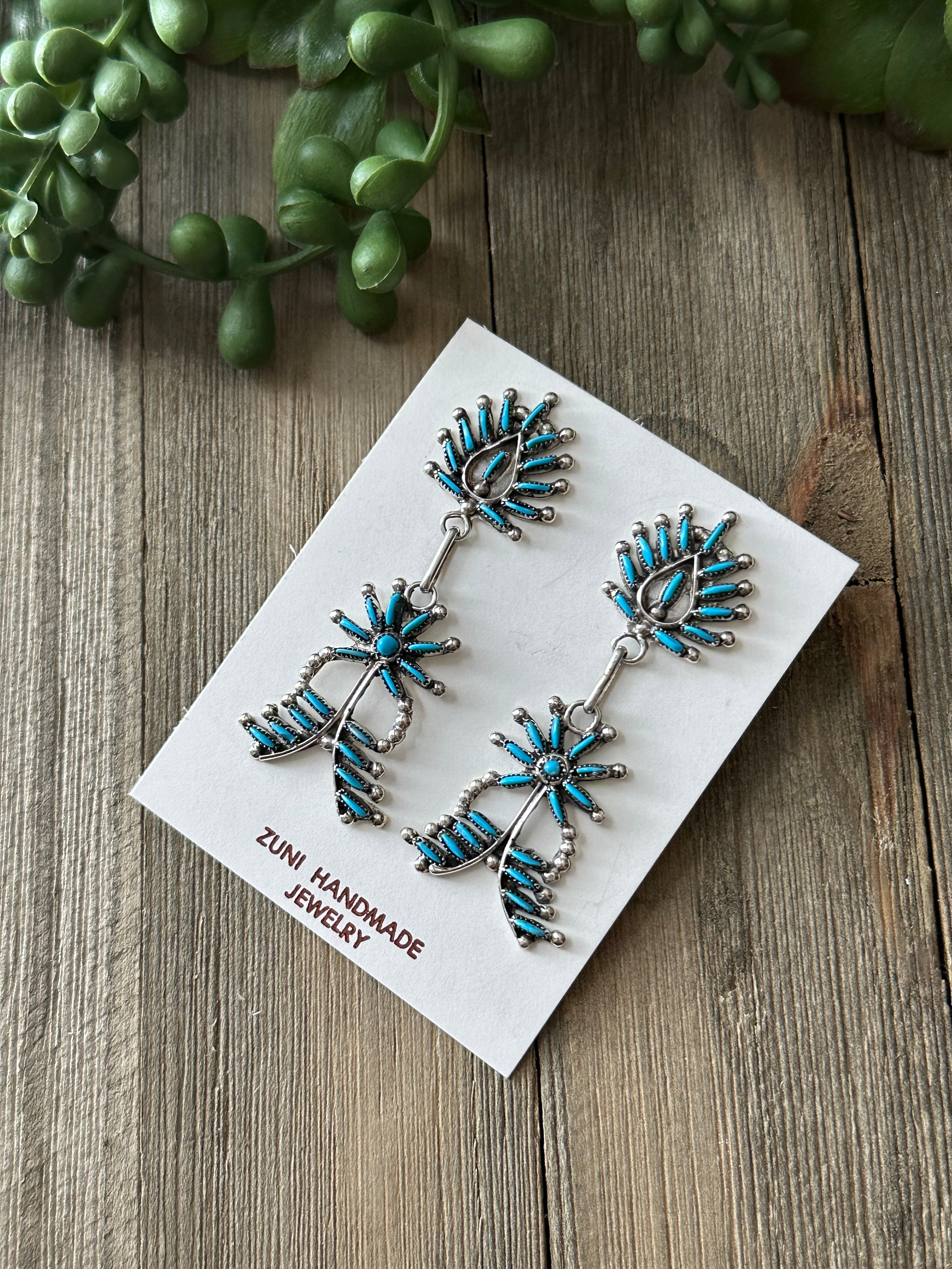 Zuni Made Turquoise & Sterling Silver Post Dangle Earrings. It measures 2 1/2 inches long and just over 3/4 of an inch wide. Signed by artist and stamped sterling silver.
