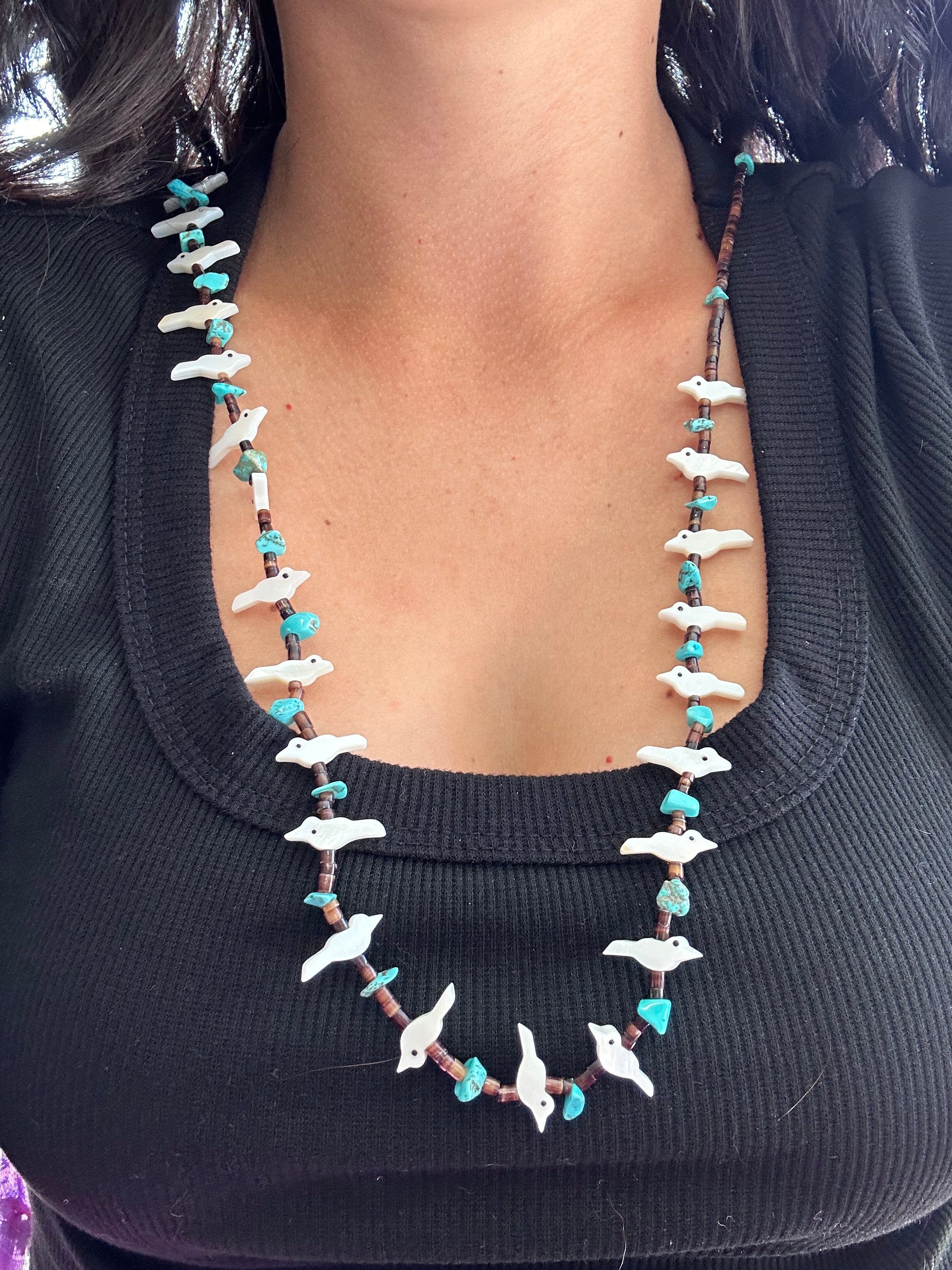 Zuni Strung Multi Stone & Sterling Silver Beaded Fetish Necklace. It measures 28 inches long.